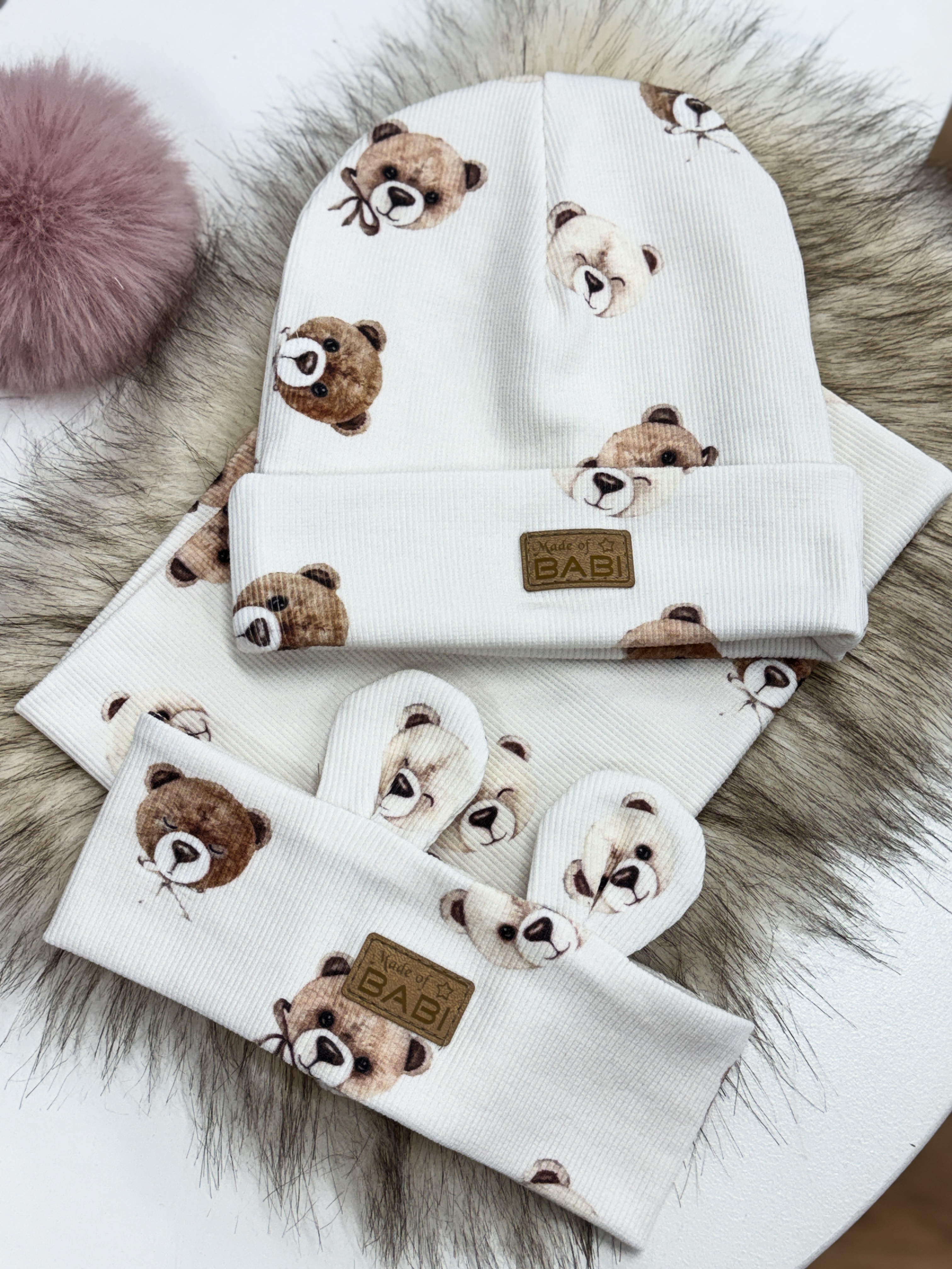 3 pak dziecięcy komplet czapka opaska komin prążkowany misiowy zawrót głowy na kremowym