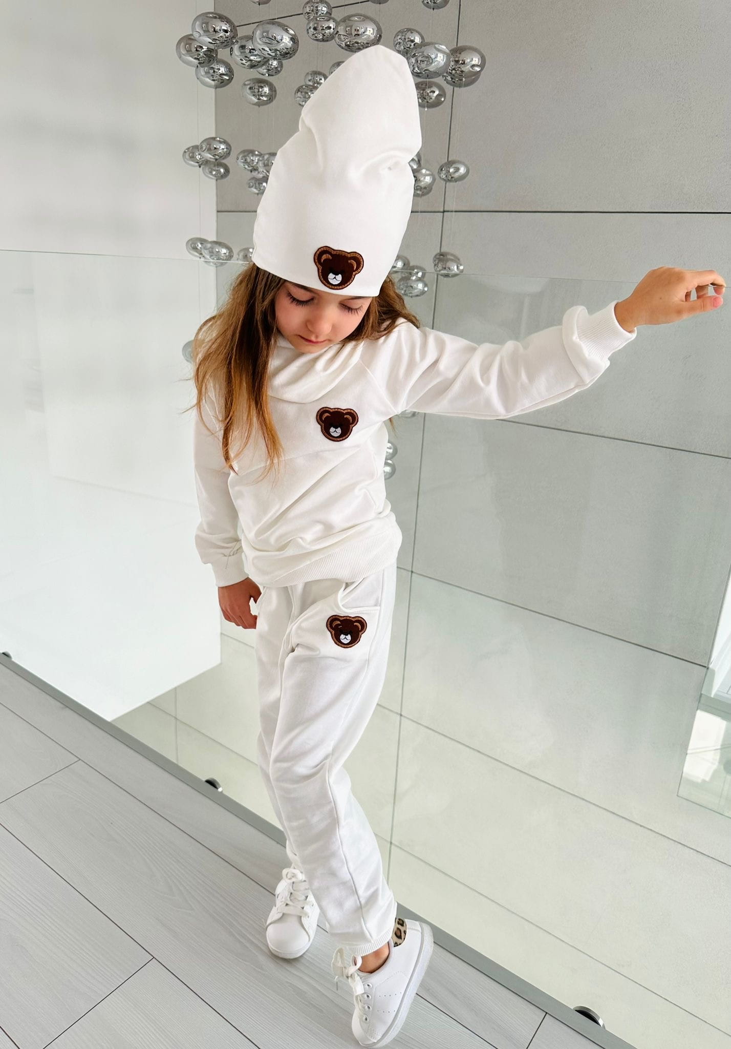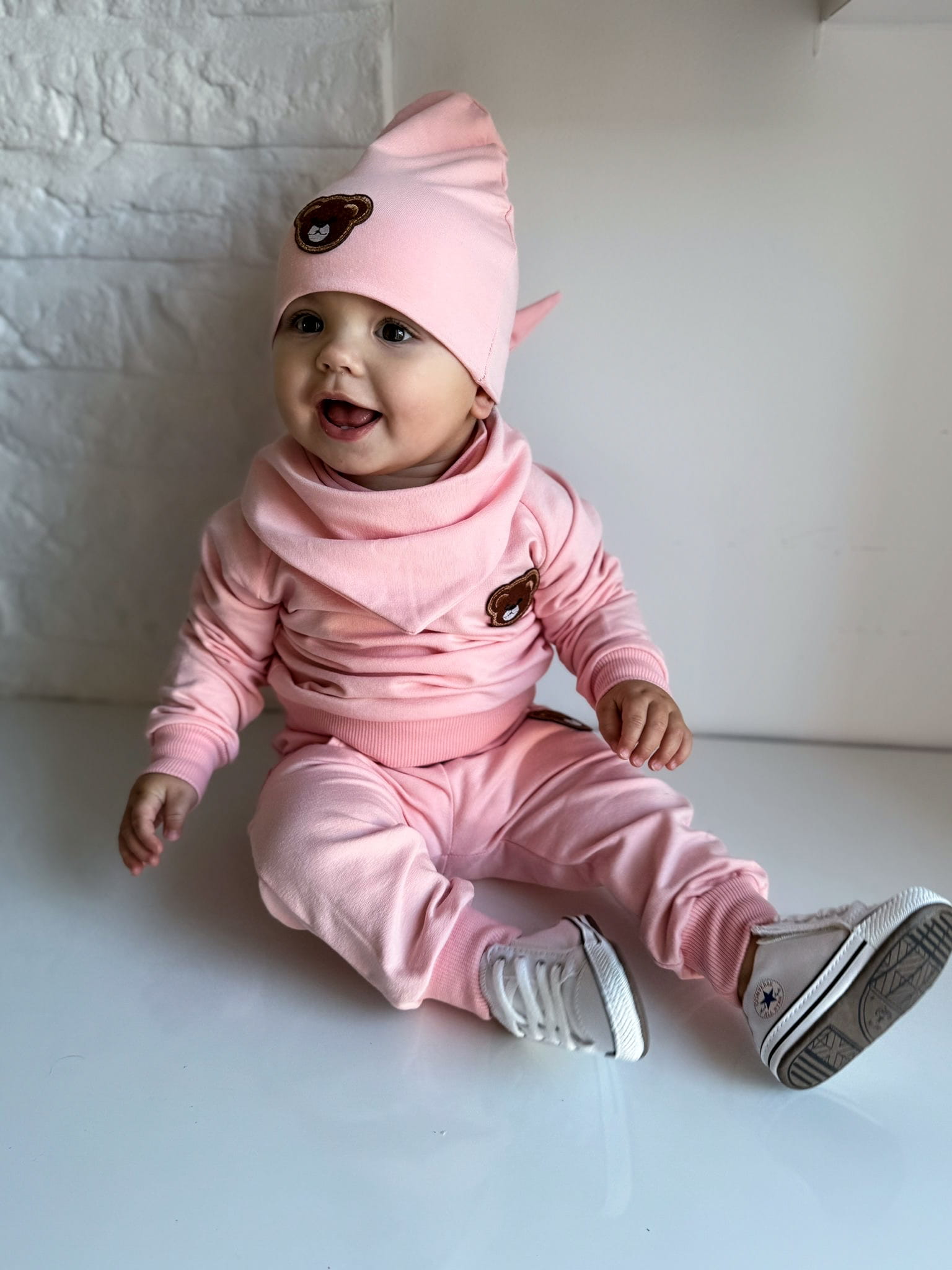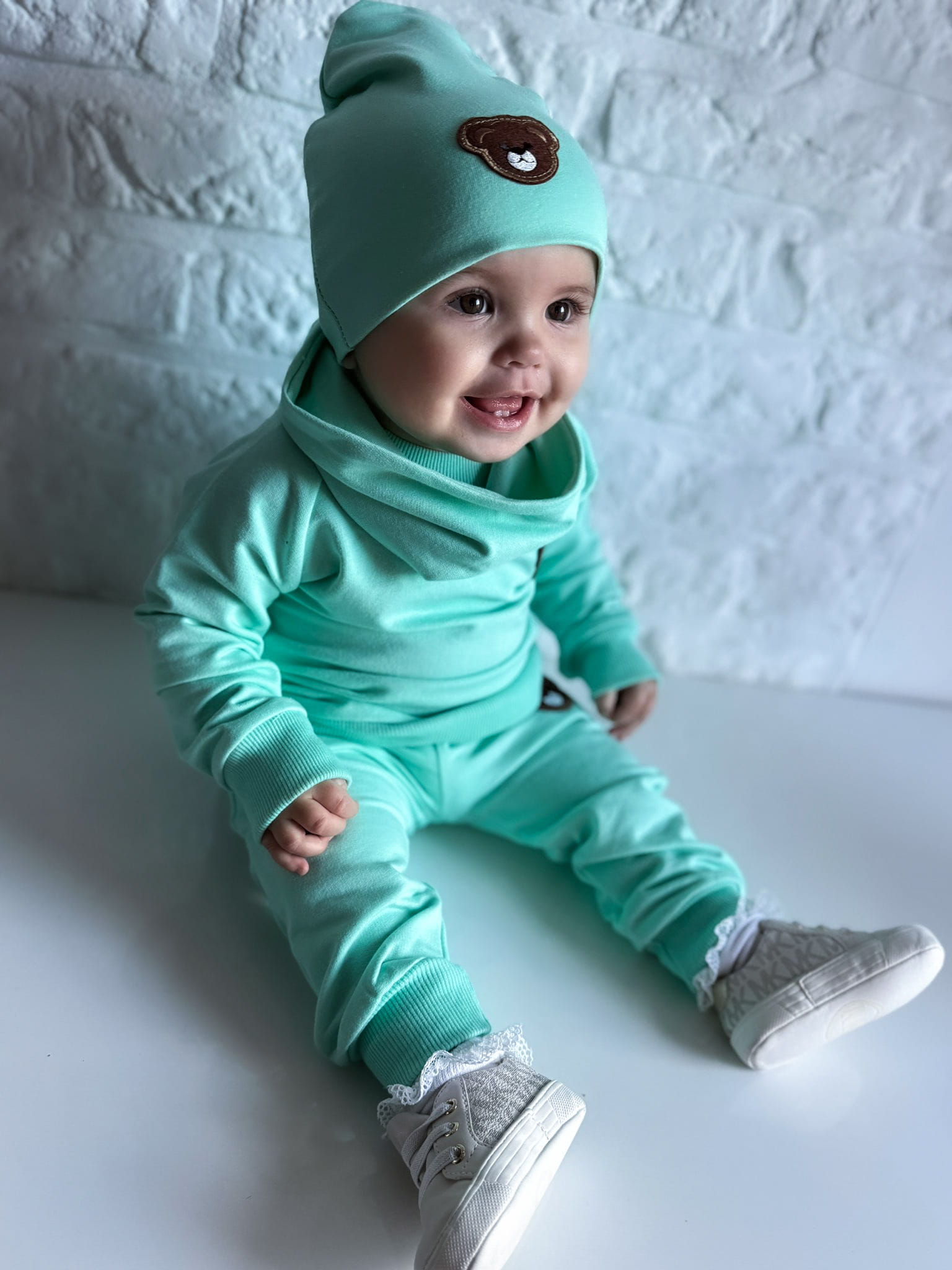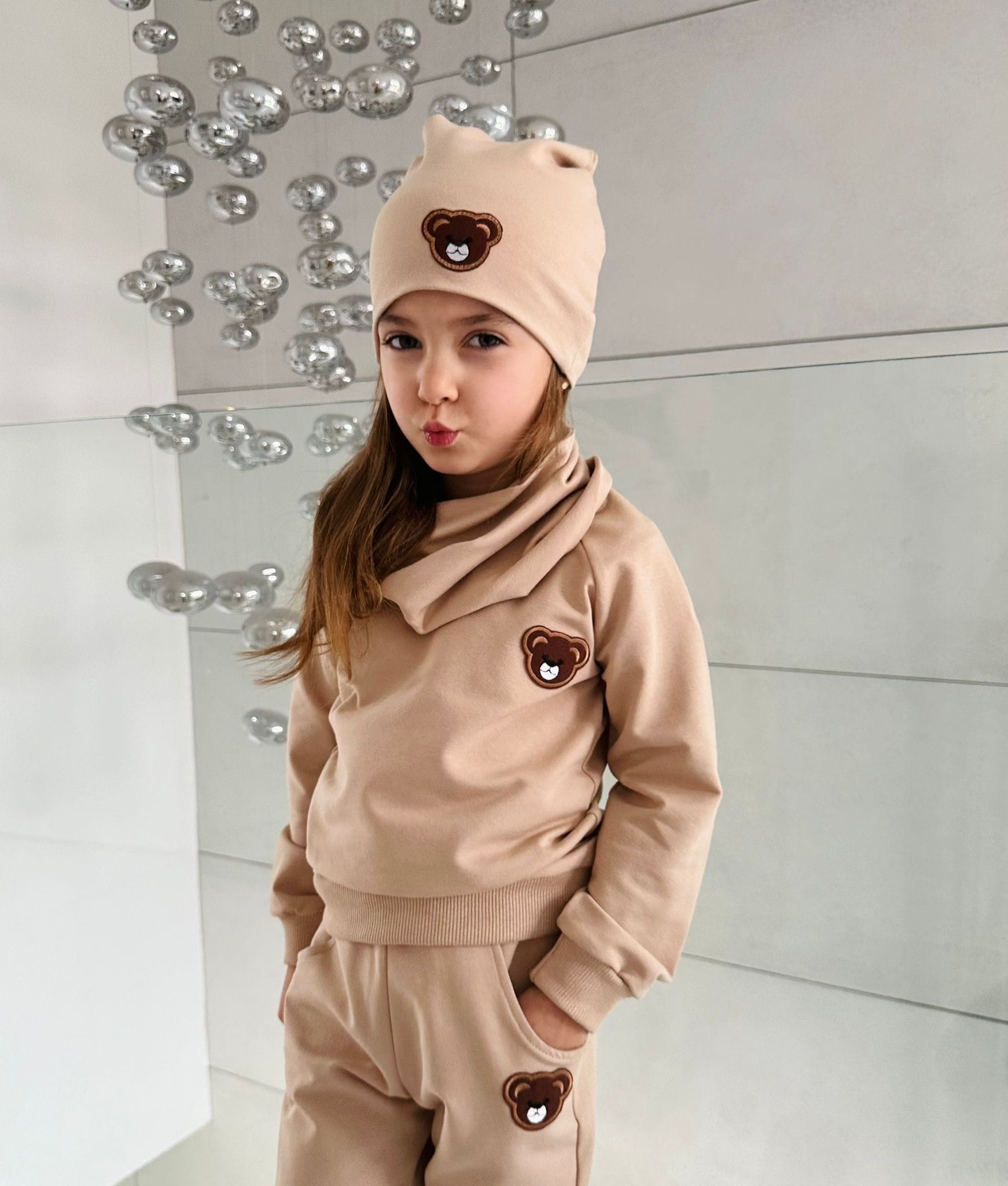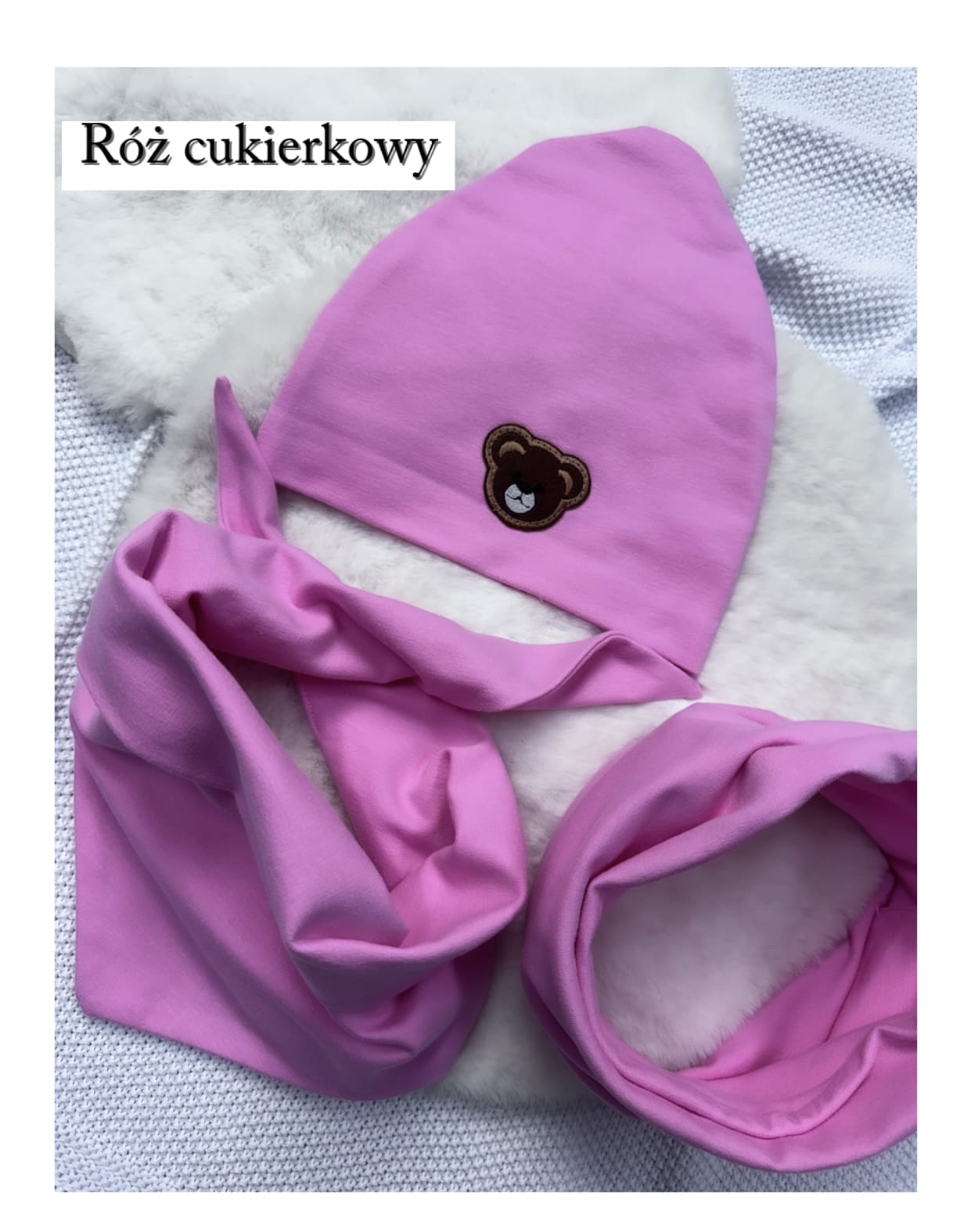 Czapka z aplikacją misia .Dodatkowo, do kompletu oferujemy również chustę lub kominek, które możesz dopasować według własnego gustu.