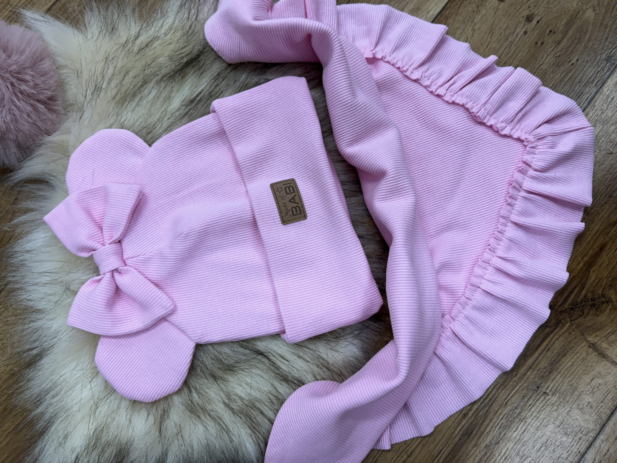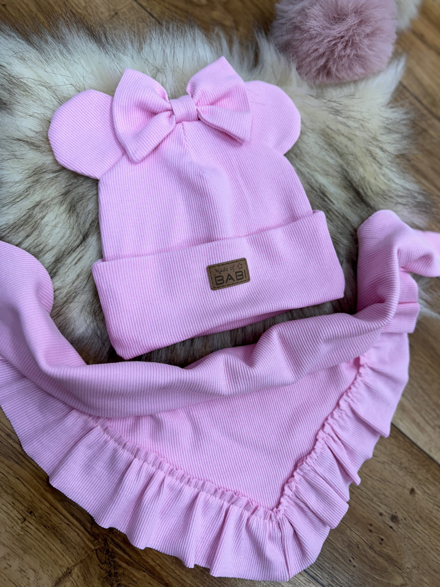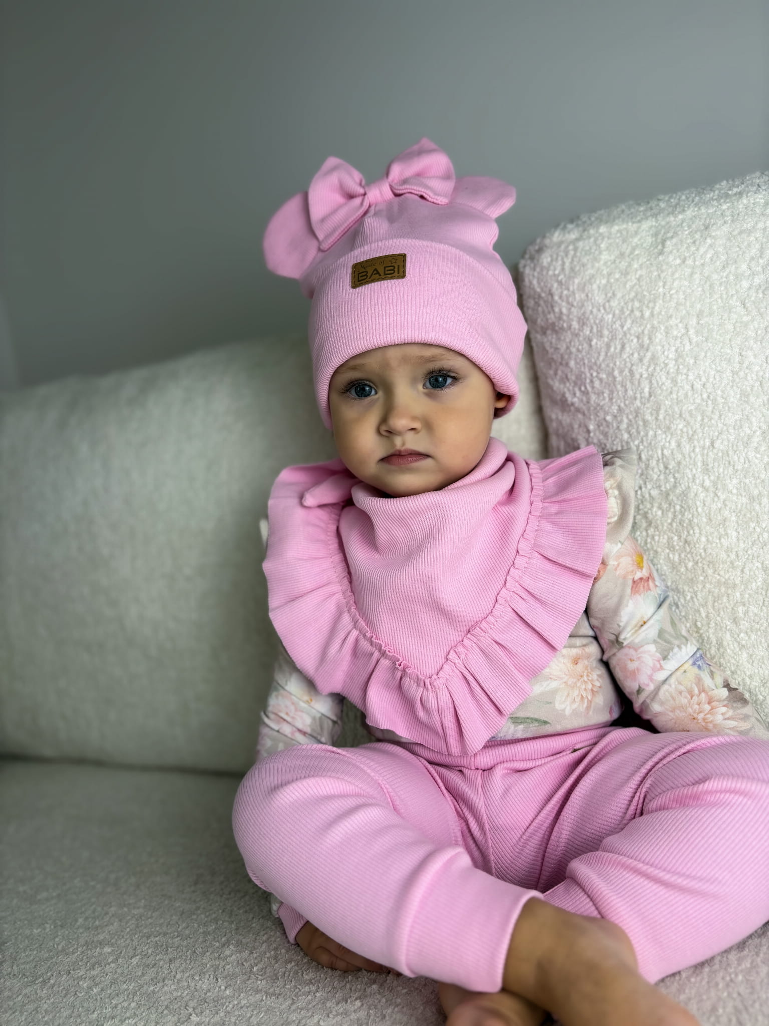 Czapka plus chusta z falbanką komplet prążkowany z kokardka/ uszka misia/ kolor jasny róż