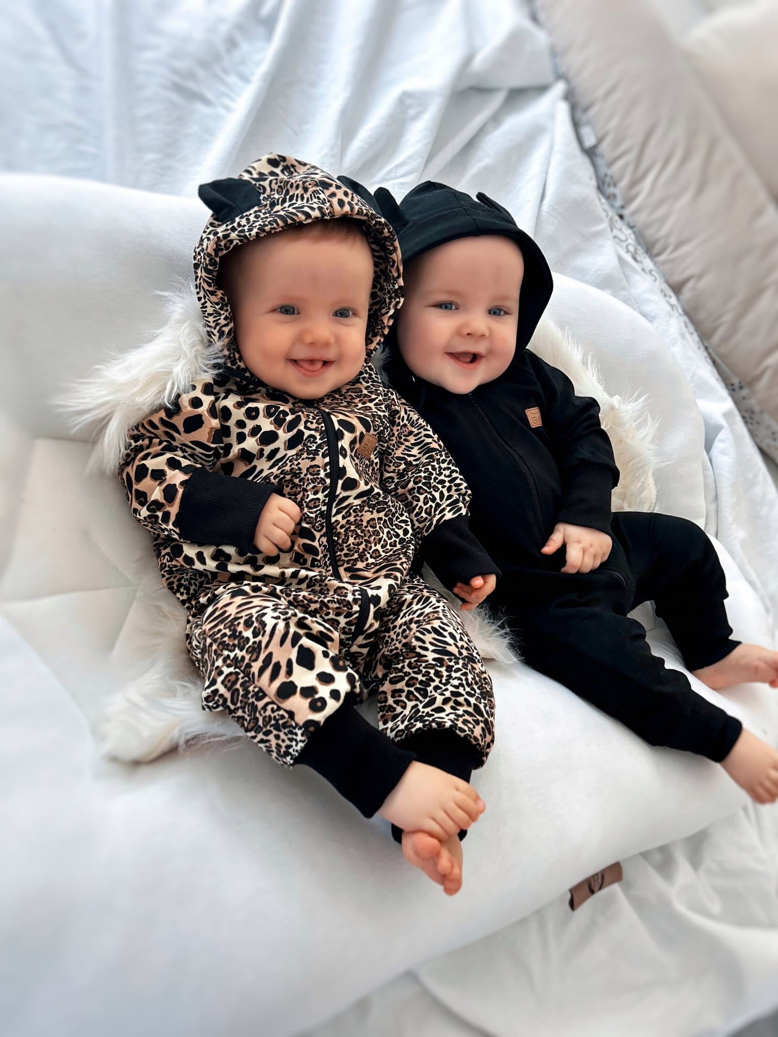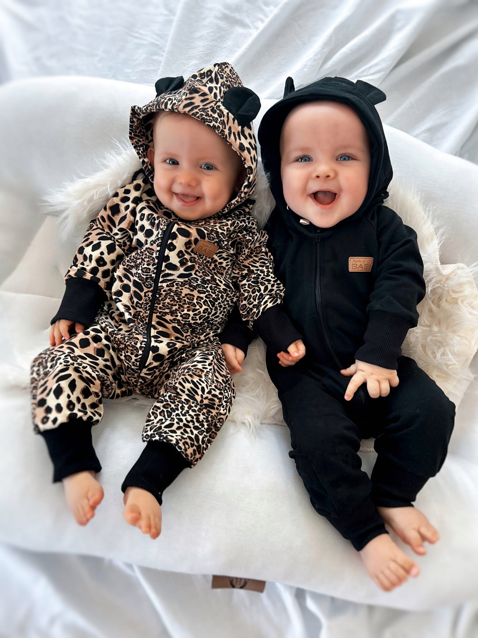 • Czarny dresowy pajac dla dziecka • Z uroczymi uszkami misia na kapturze • Zapinany na wygodny zamek błyskawiczny • Miękki i elastyczny materiał zapewniający komfort • Idealny na zabawę, spacery i codzienne noszenie