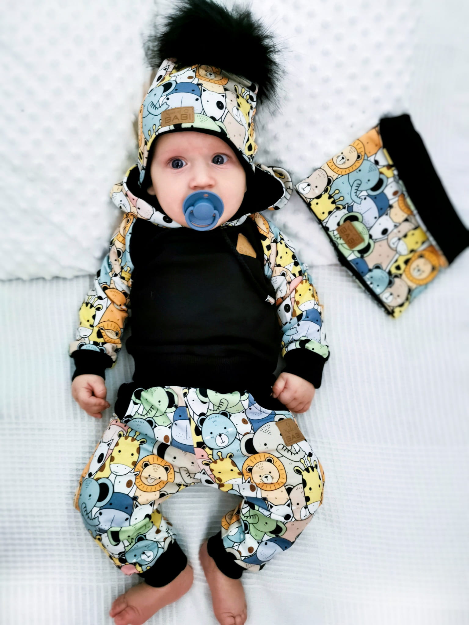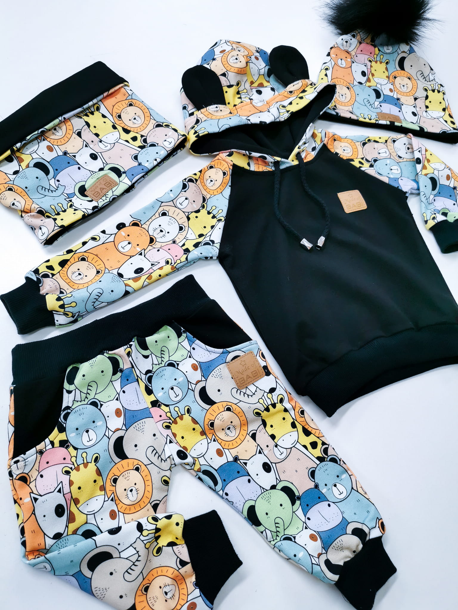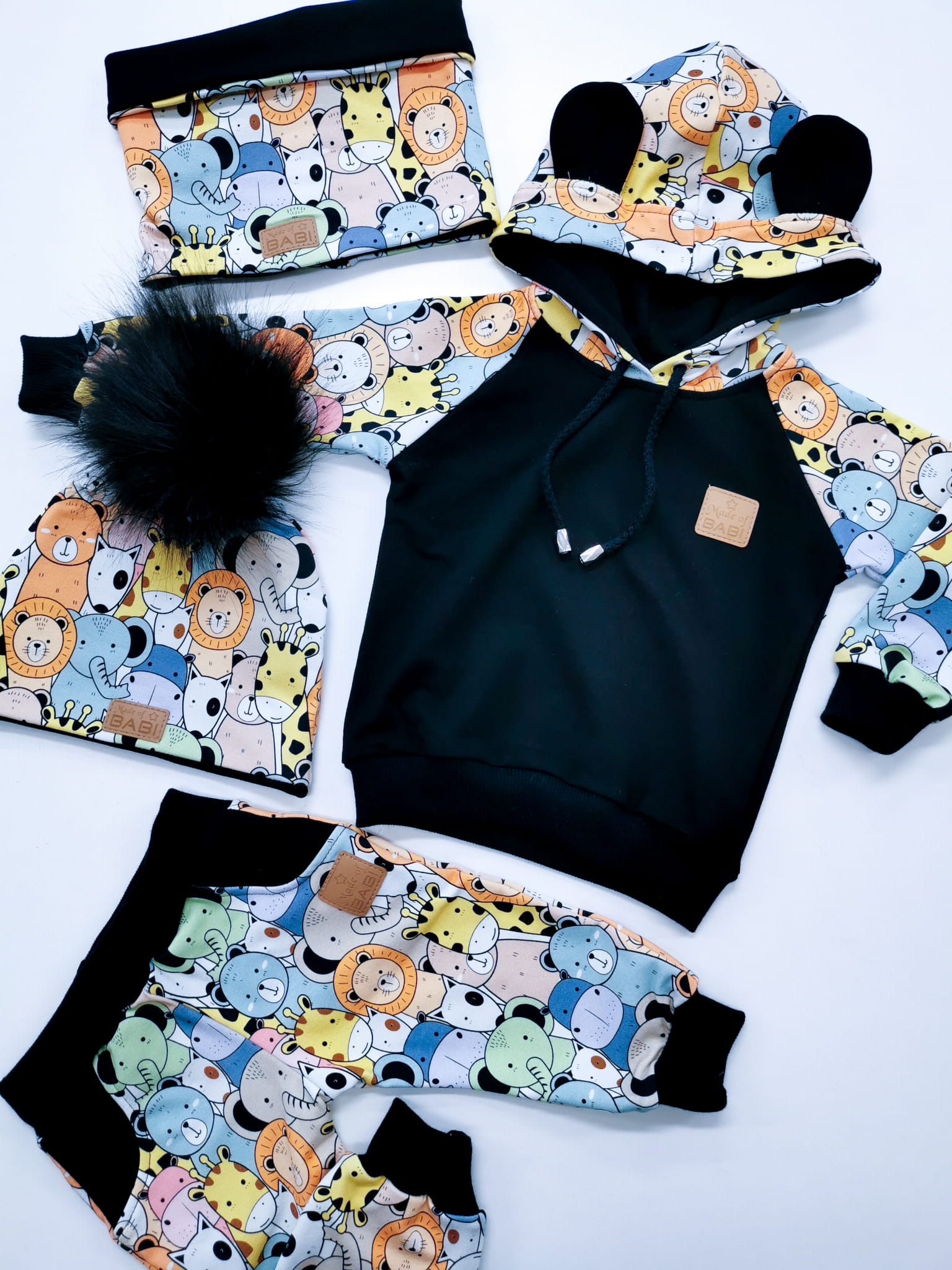 Dres dla chłopca kolorowe zoo bluza z kapturem i uszkami plus spodnie dresowe