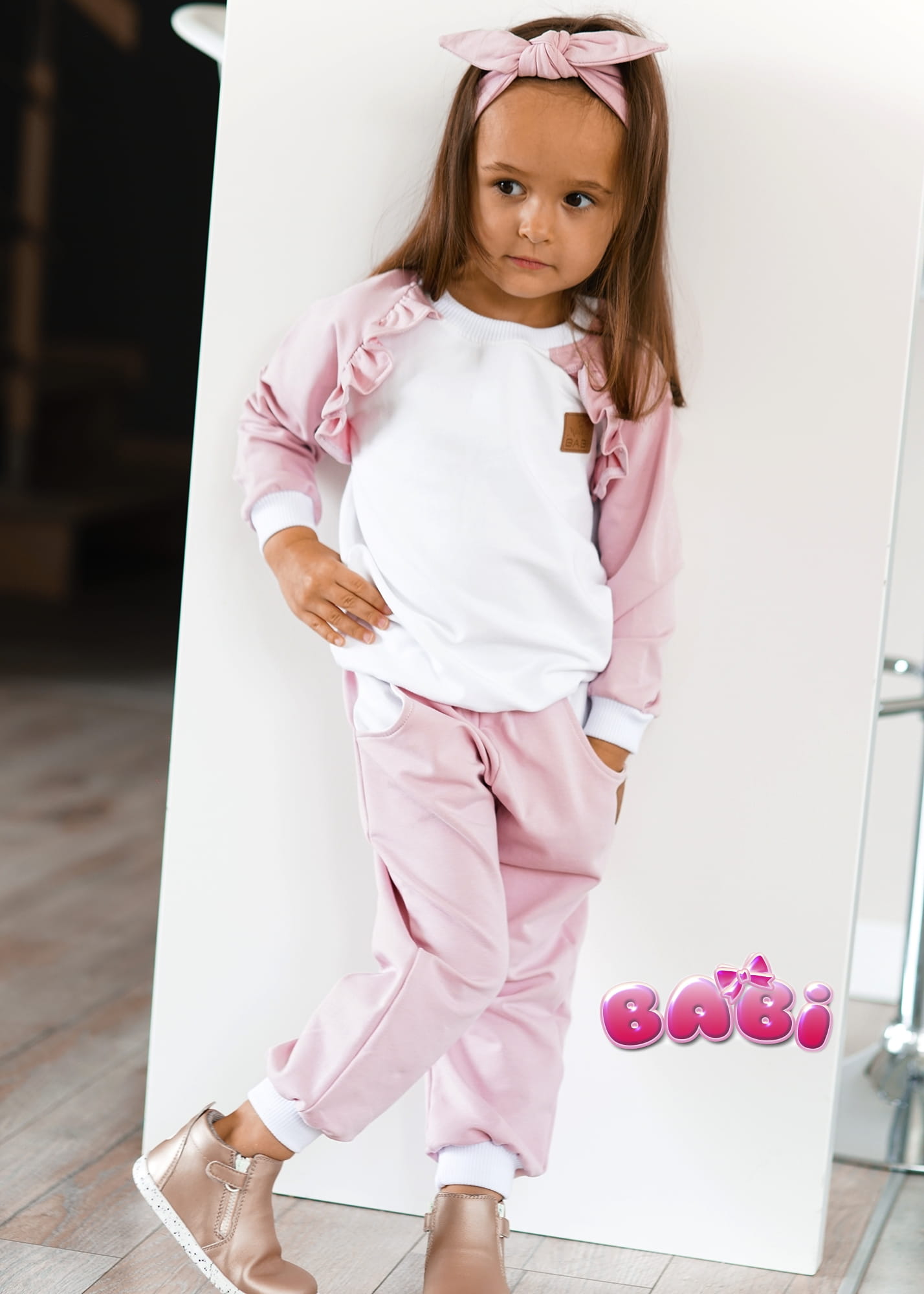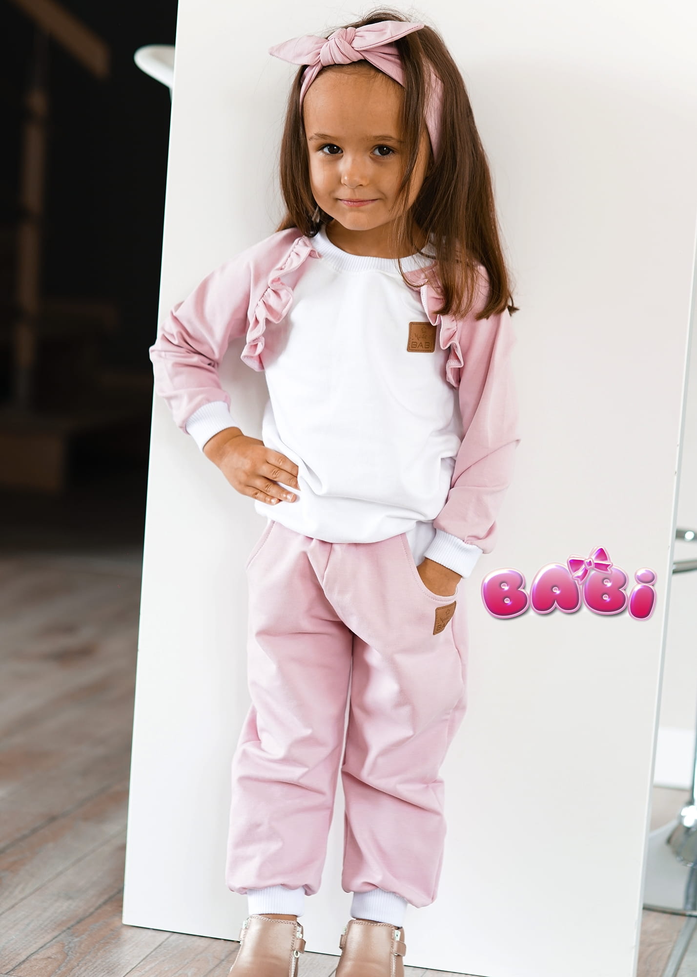 Producent Małgorzata LochertDres dziecięcy róż jasny + biel - leginsy z falbankami na pupie+body lub bluzka ze skrzydełkiem oraz opaska BABI kokarda