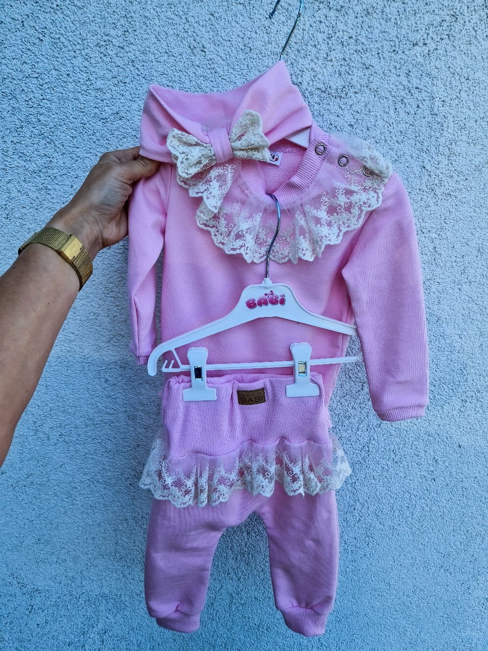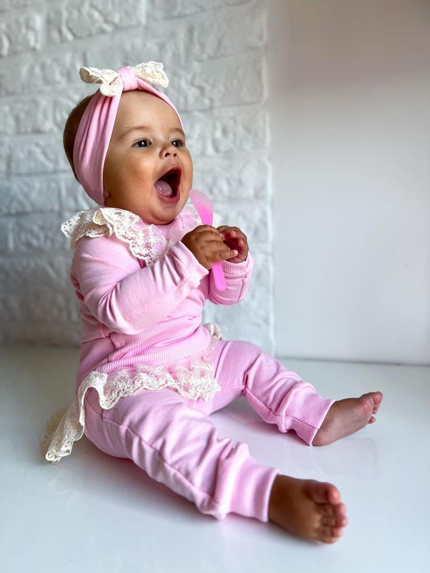 Elegancki komplet dla dziewczynki z koronką body lub bluzka plus spodnie z wysokim stanem oraz opaska z kokardką Nikola kolory do wyboru