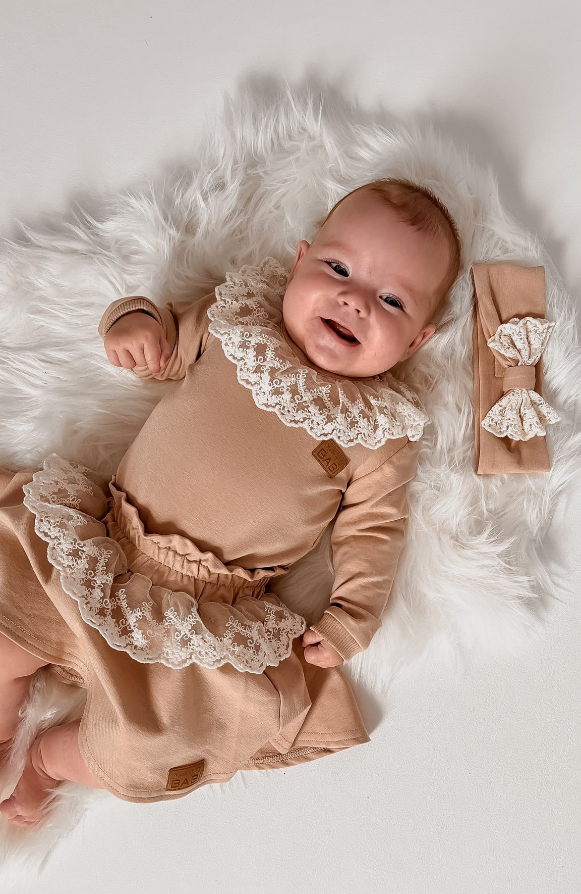 Producent Małgorzata LochertKomplet dla dziewczynki CELIA spódniczka z koronką + body/bluzka + opaska z kokardką