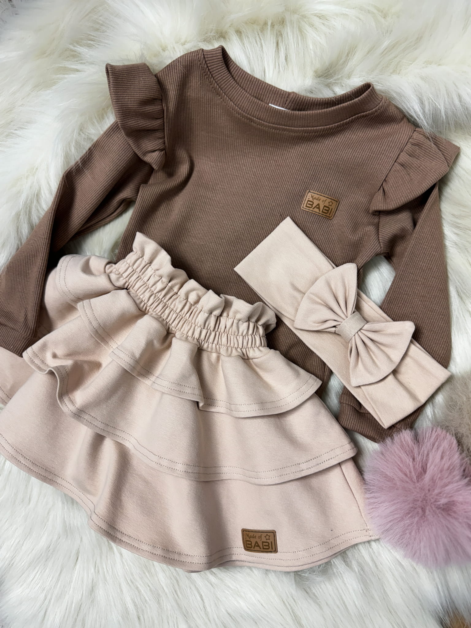 Uroczy komplecik dla dziewczynki składający się z beżowej spódniczki z falbankami, pasującej opaski z kokardką oraz prążkowanego body lub bluzki w kolorze czekoladowym. Wykonany z miękkich i elastycznych materiałów, zapewnia maksymalny komfort noszenia przez cały dzień. Zestaw jest idealny na wiosenne spacery, rodzinne uroczystości, przedszkole czy codzienne stylizacje. Beżowa spódniczka z falbankami nadaje lekkości i dziewczęcego uroku, a prążkowane body lub bluzka w ciepłym czekoladowym kolorze świetnie komponuje się z opaską z kokardką. Komplecik łączy wygodę, funkcjonalność i elegancki design, który pokocha każda mała modnisią.