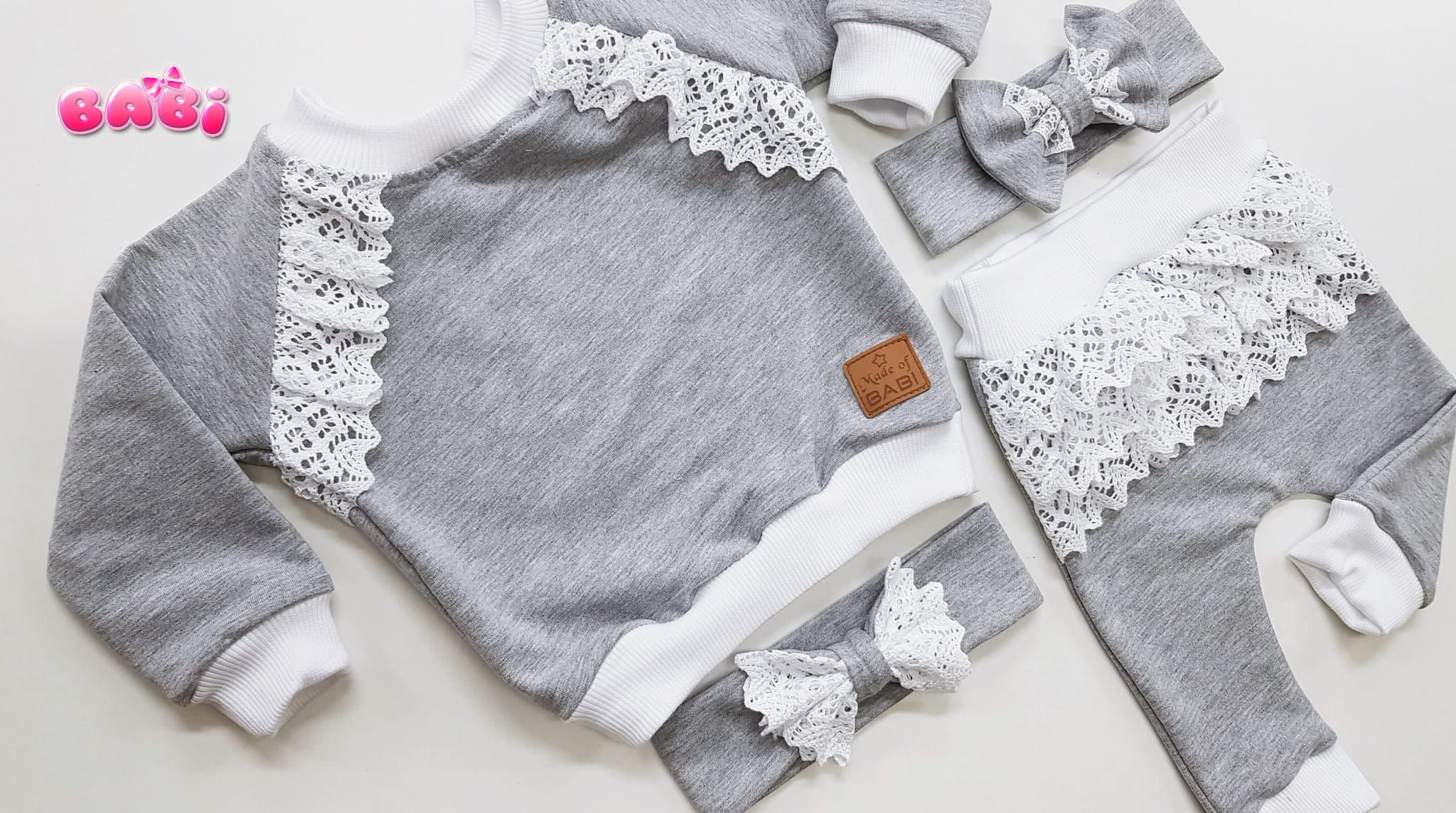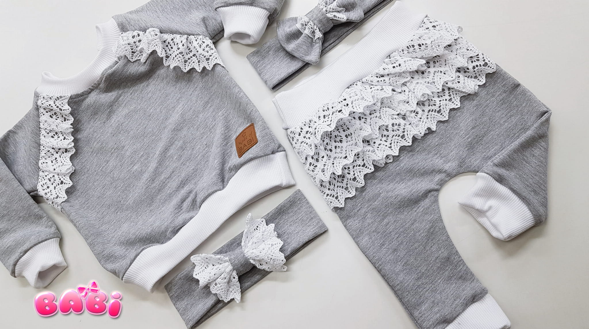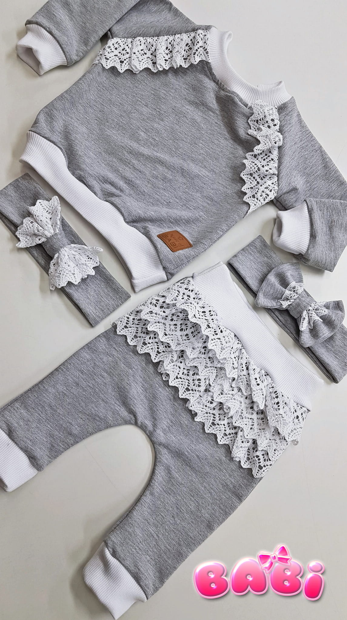 Komplecik dziecięcy Sevilla Tic - koronka dres- bluza-spodnie z falbankami z koronki, opaska z kokardką