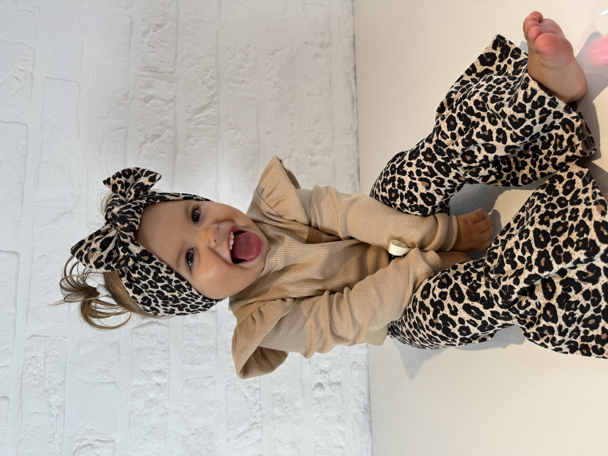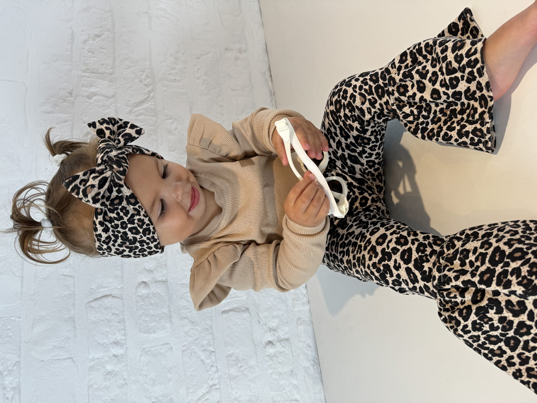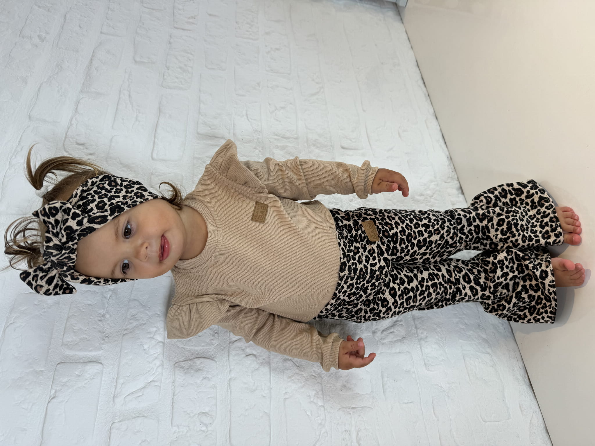 Komplet dla dziewczynek dres dzwony panterka kropeczki plus opaska oraz prążkowane body lub bluzka beżowa