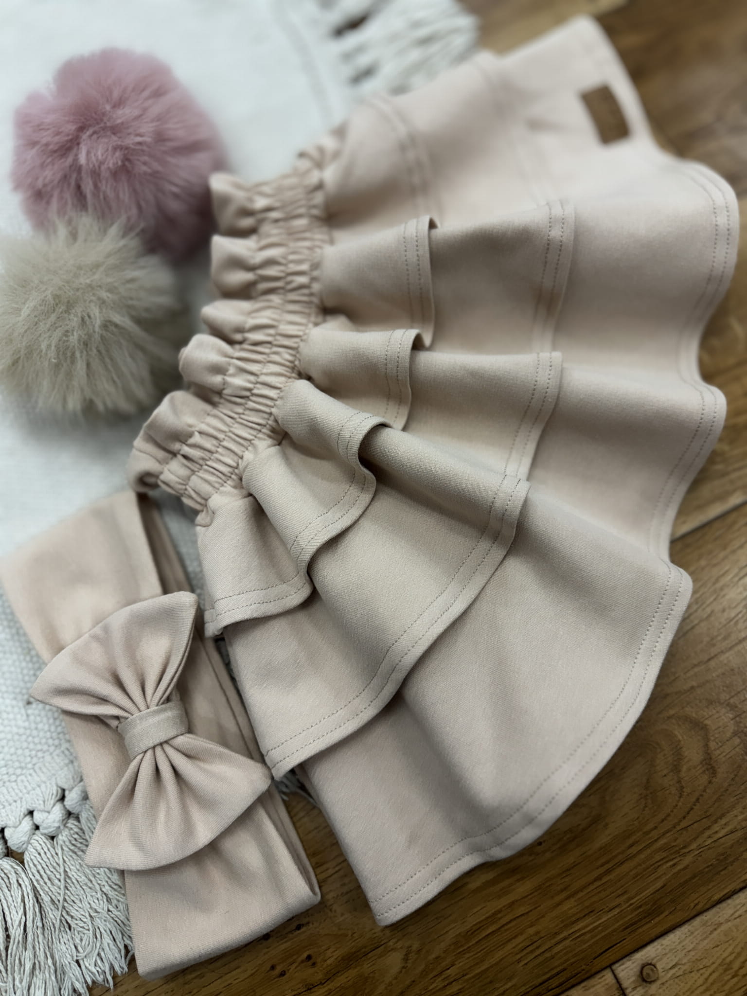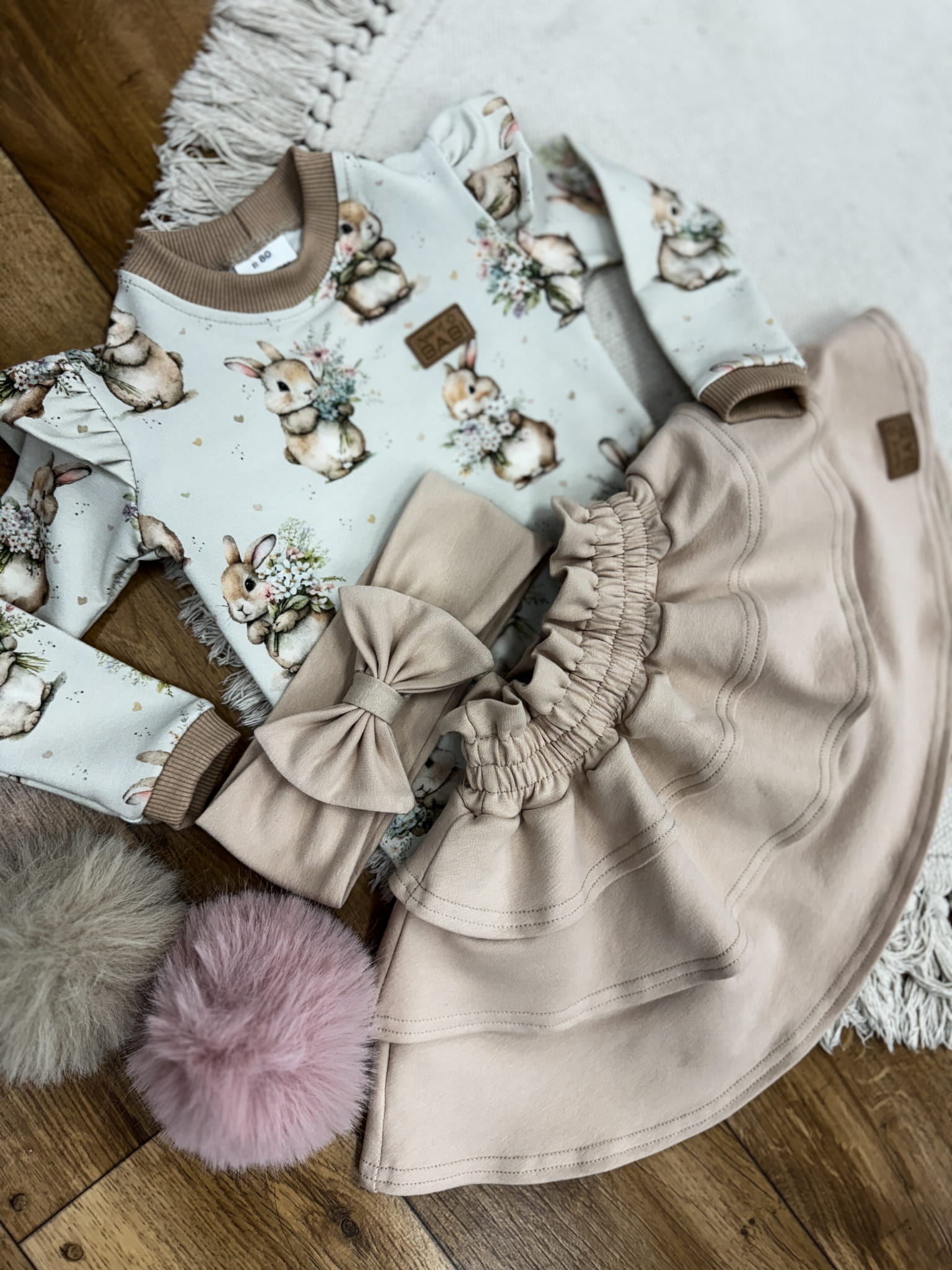Uroczy komplet dla dziewczynki składający się z body lub bluzki z zajączkami wielkanocnymi, beżowej spódniczki z falbankami „love” oraz ozdobnej opaski z kokardką. Wykonany z miękkich i elastycznych materiałów, zapewnia pełną swobodę ruchów i komfort noszenia przez cały dzień. Delikatny motyw zajączków w połączeniu z dziewczęcymi falbankami i subtelną kokardką tworzy wyjątkowy, świąteczny look idealny na Wielkanoc, rodzinne uroczystości, sesje zdjęciowe lub codzienne stylizacje wymagające uroku i elegancji.