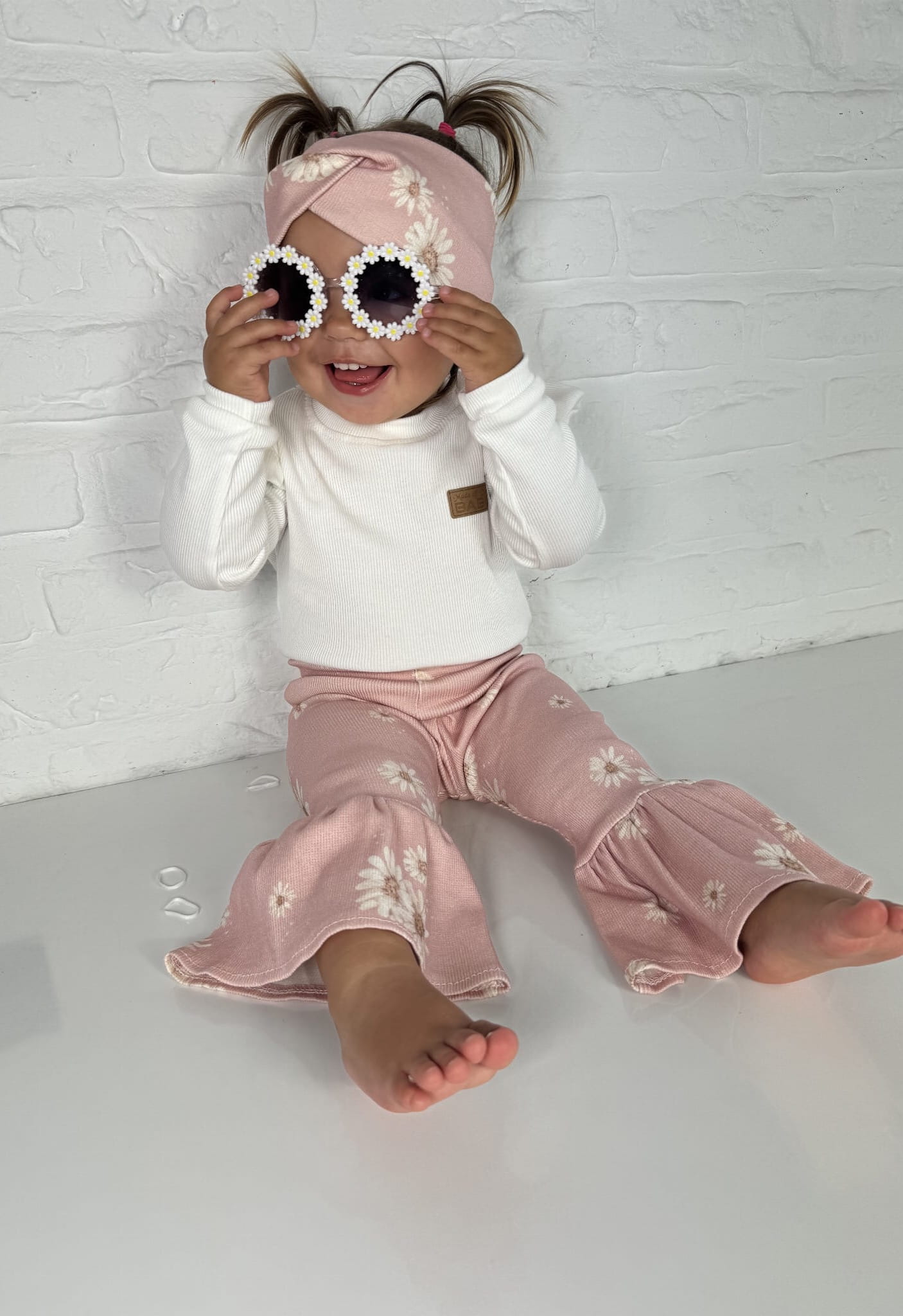 Komplet dla dziewczynki dzwony prążkowane stokrotki na różu plus opaska plus body lub bluzka kremowa prążkowana