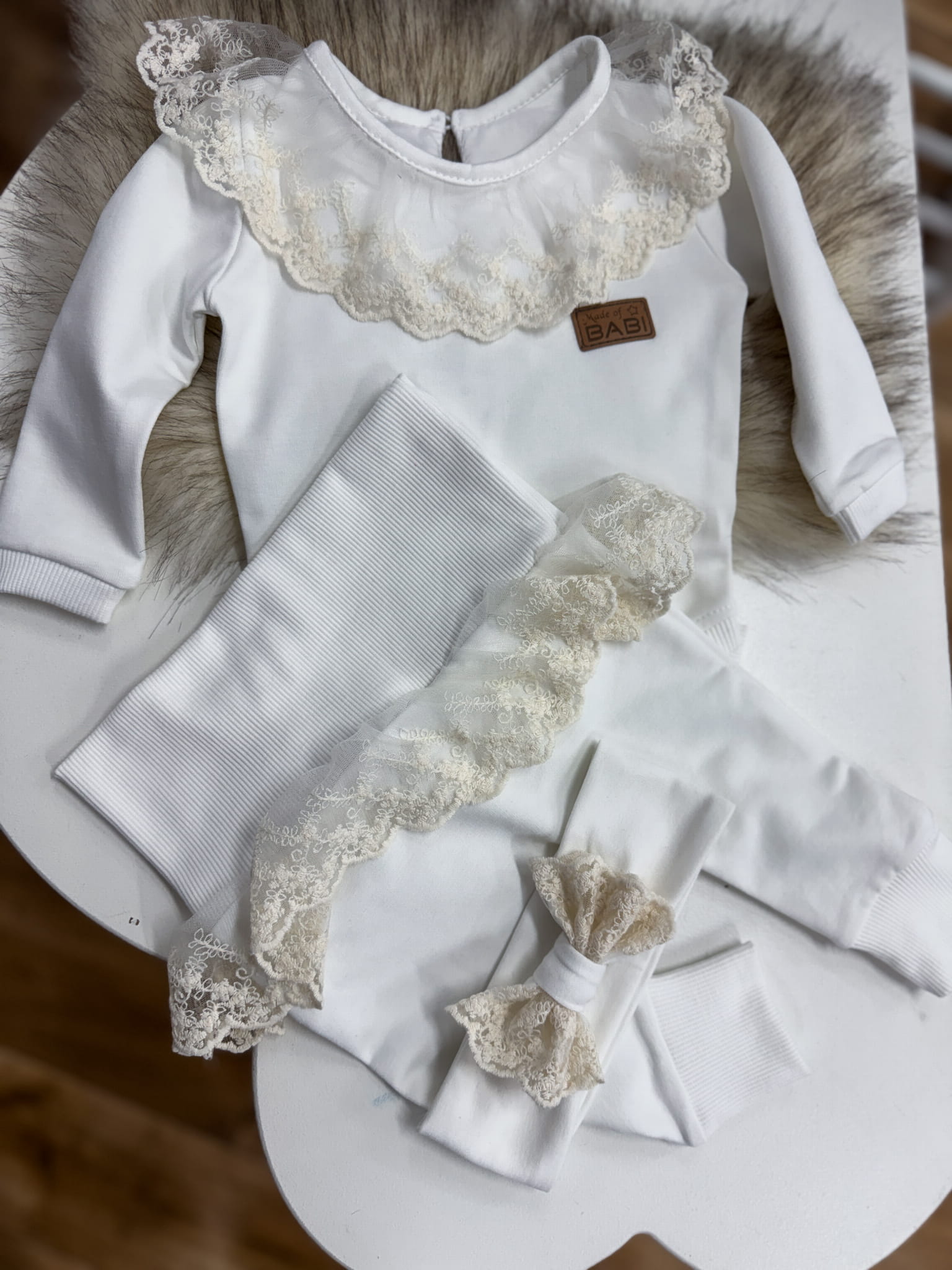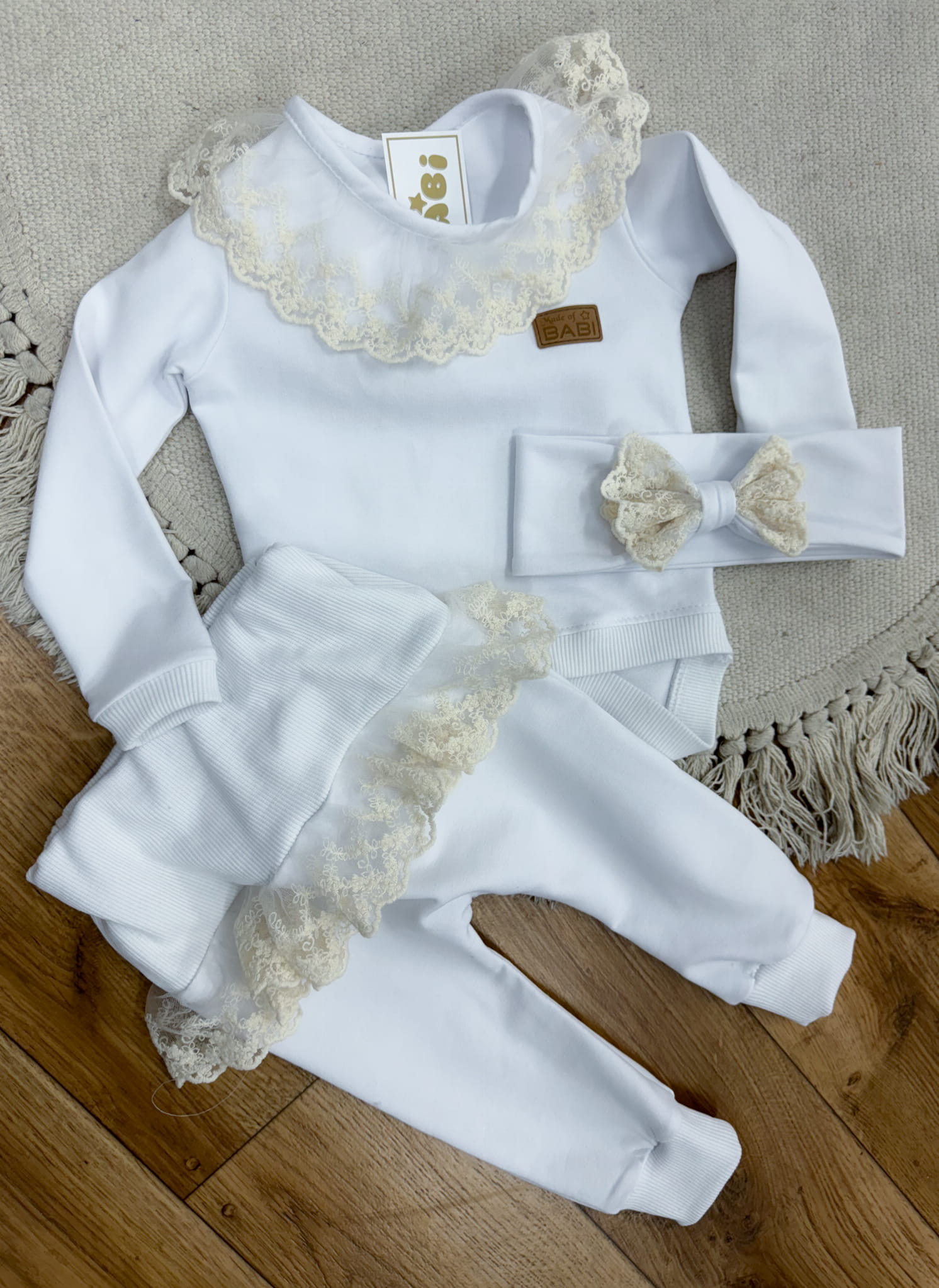 Producent Małgorzata LochertKomplet dziewczęcy na chrzest tunika z koronką plus spodnie dzwony i opaska prążkowany kremowy Oasis