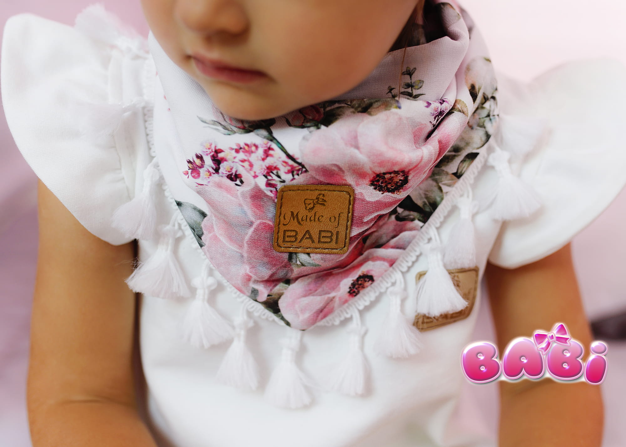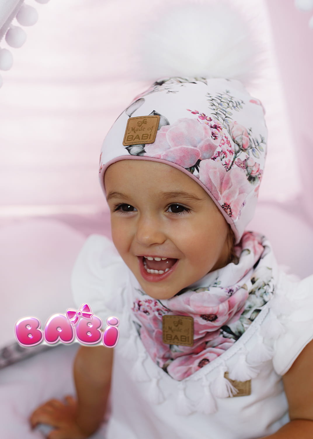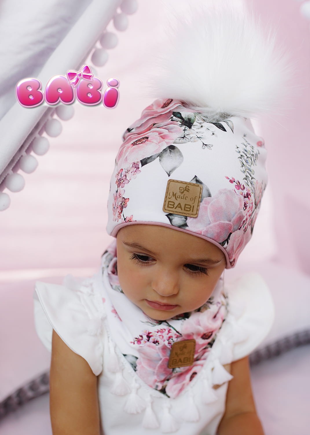 Komplet dziecięcy czapka z pomponem +chusta z chwostami /komin Tajemnicze róże+ biel