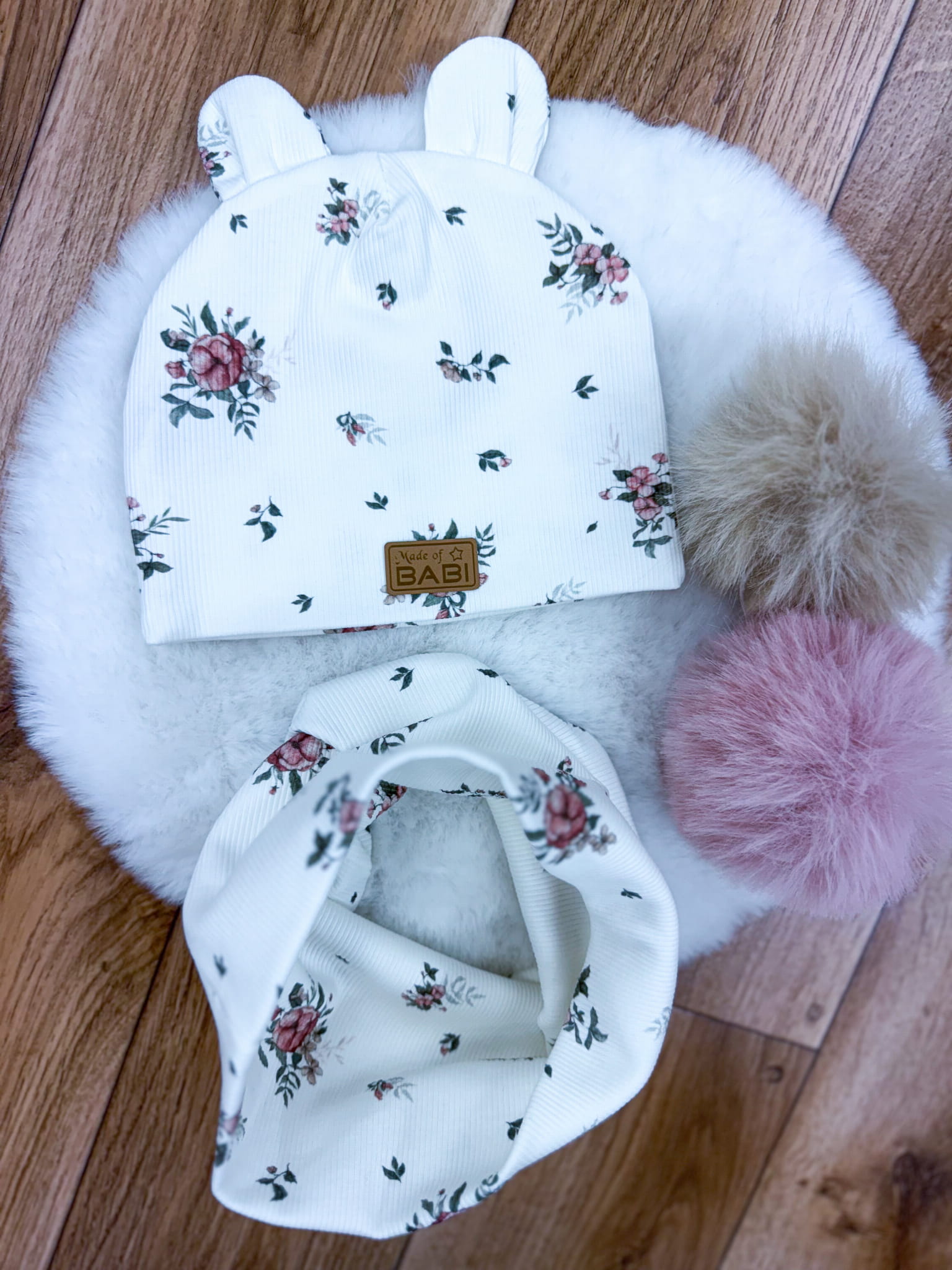 Producent Małgorzata LochertKomplet wiosna/jesień dziecięcy Rib prążek czapka uszka misia plus komin stokrotki na różu