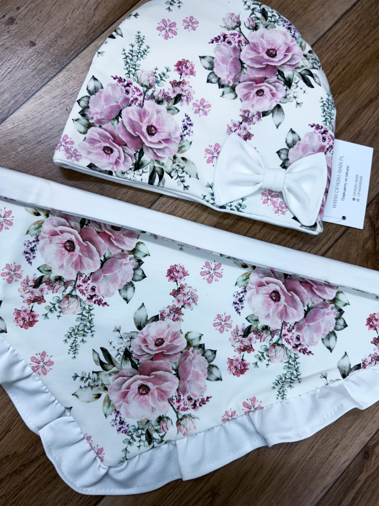 Komplet wiosna/jesień czapka z kremowa kokardka plus chusta z kremowa falbanka Tajemnicze róże