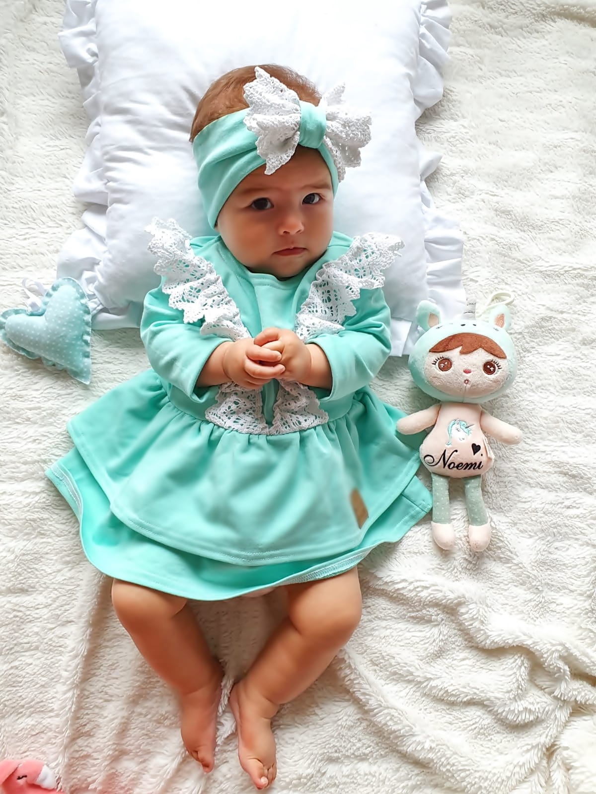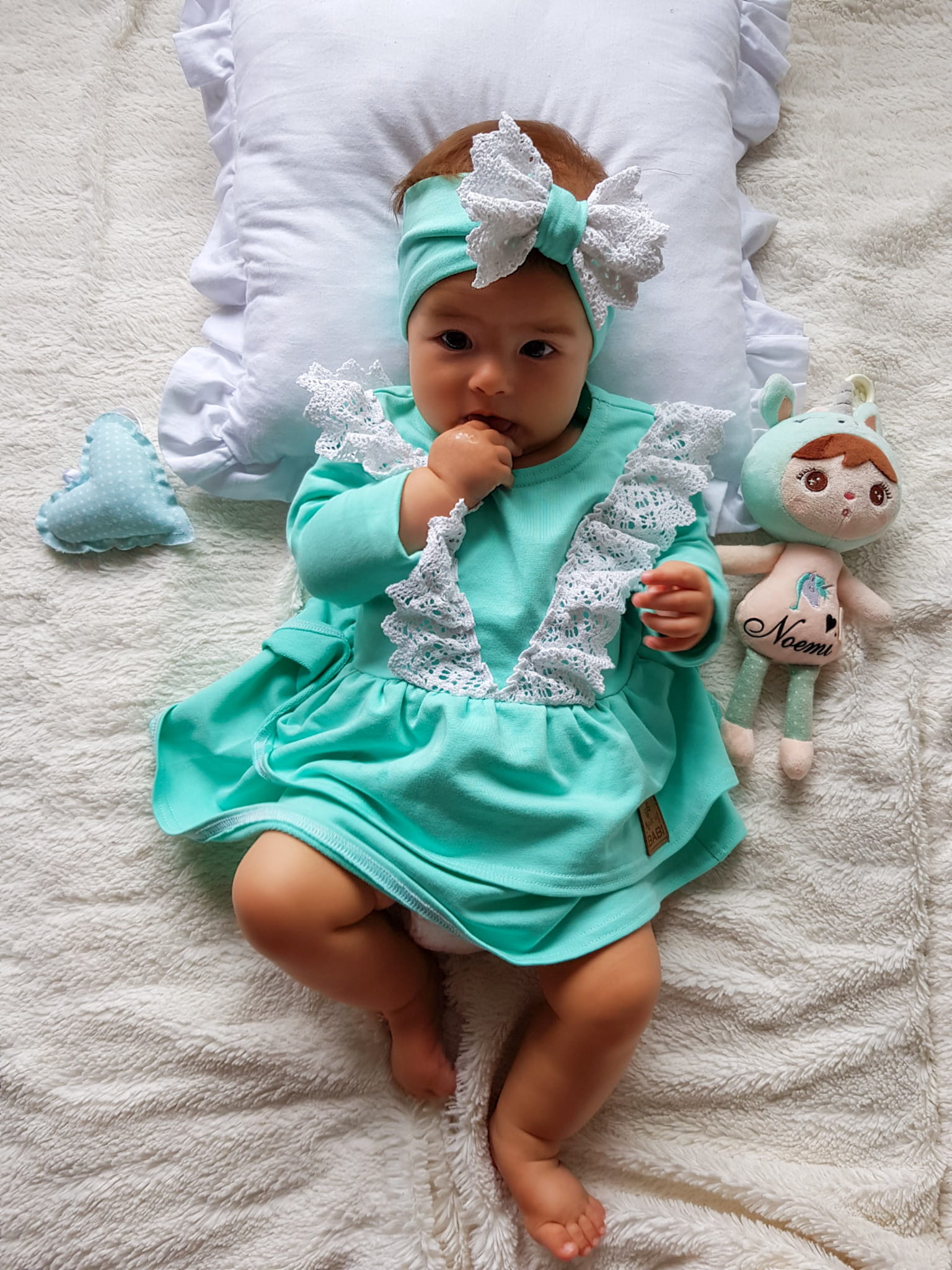 Miętowa sukienka Marietta z białą koronka oraz szeroka opaską z kokardką z koronki