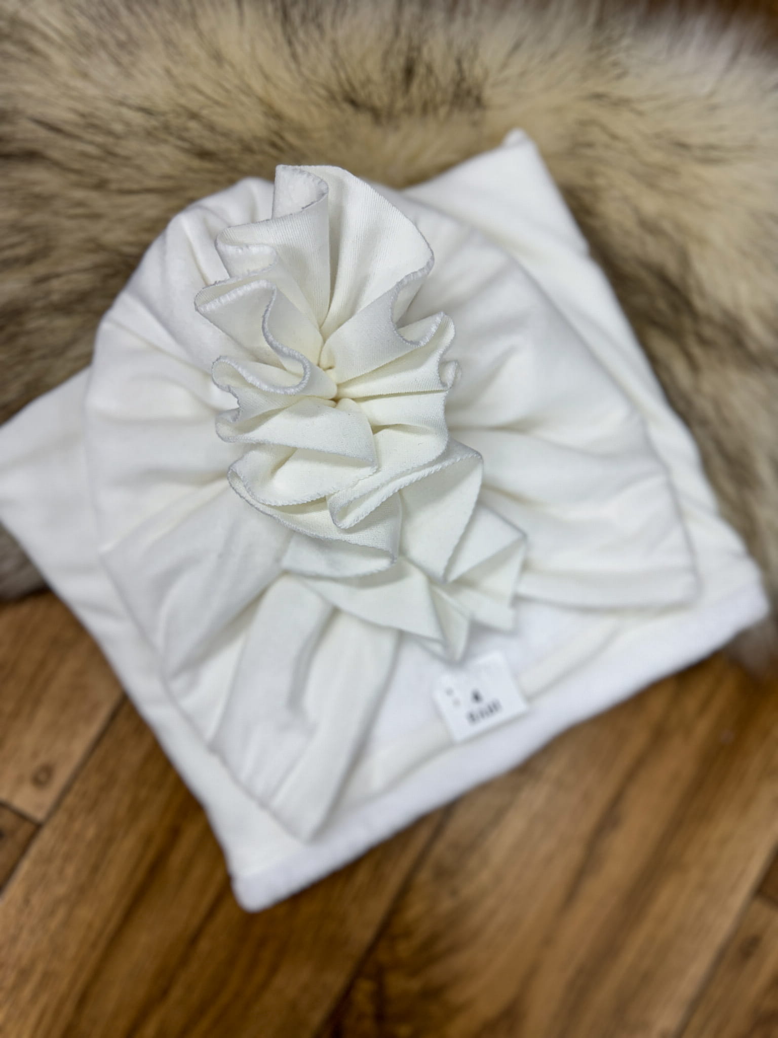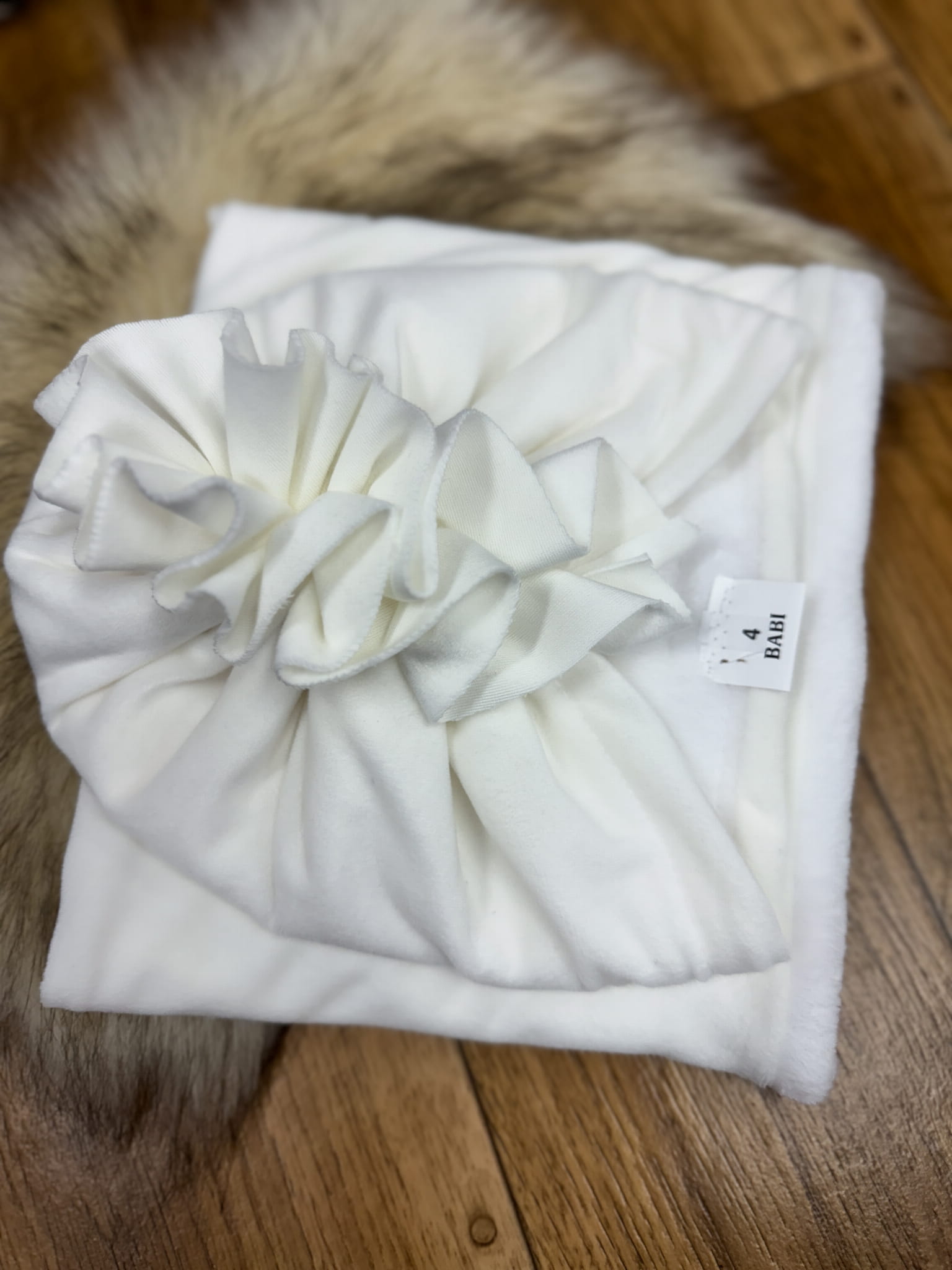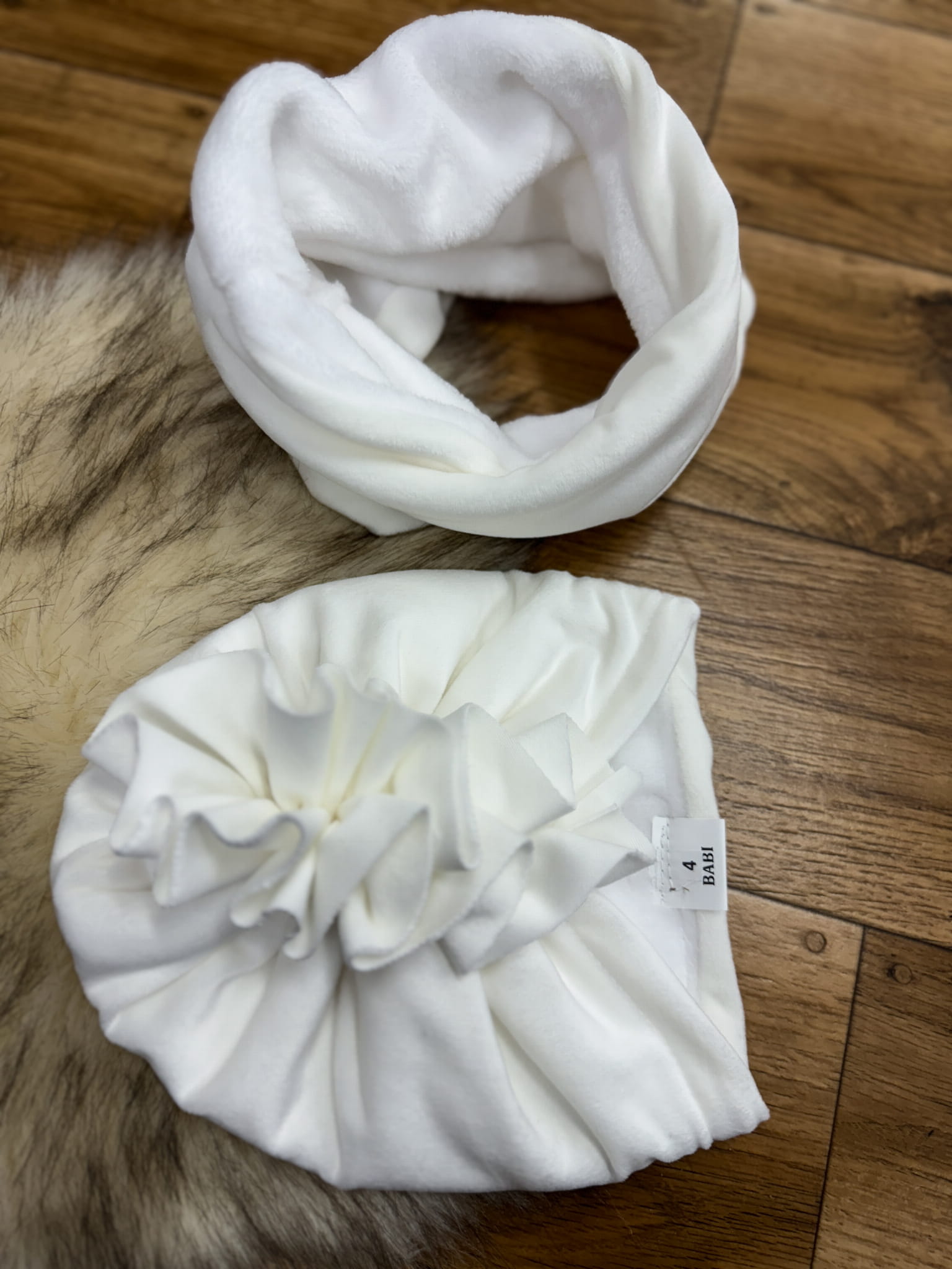 Ocieplany komplet dla dziewczynki kremowy welur na zimę jesień turban plus komin