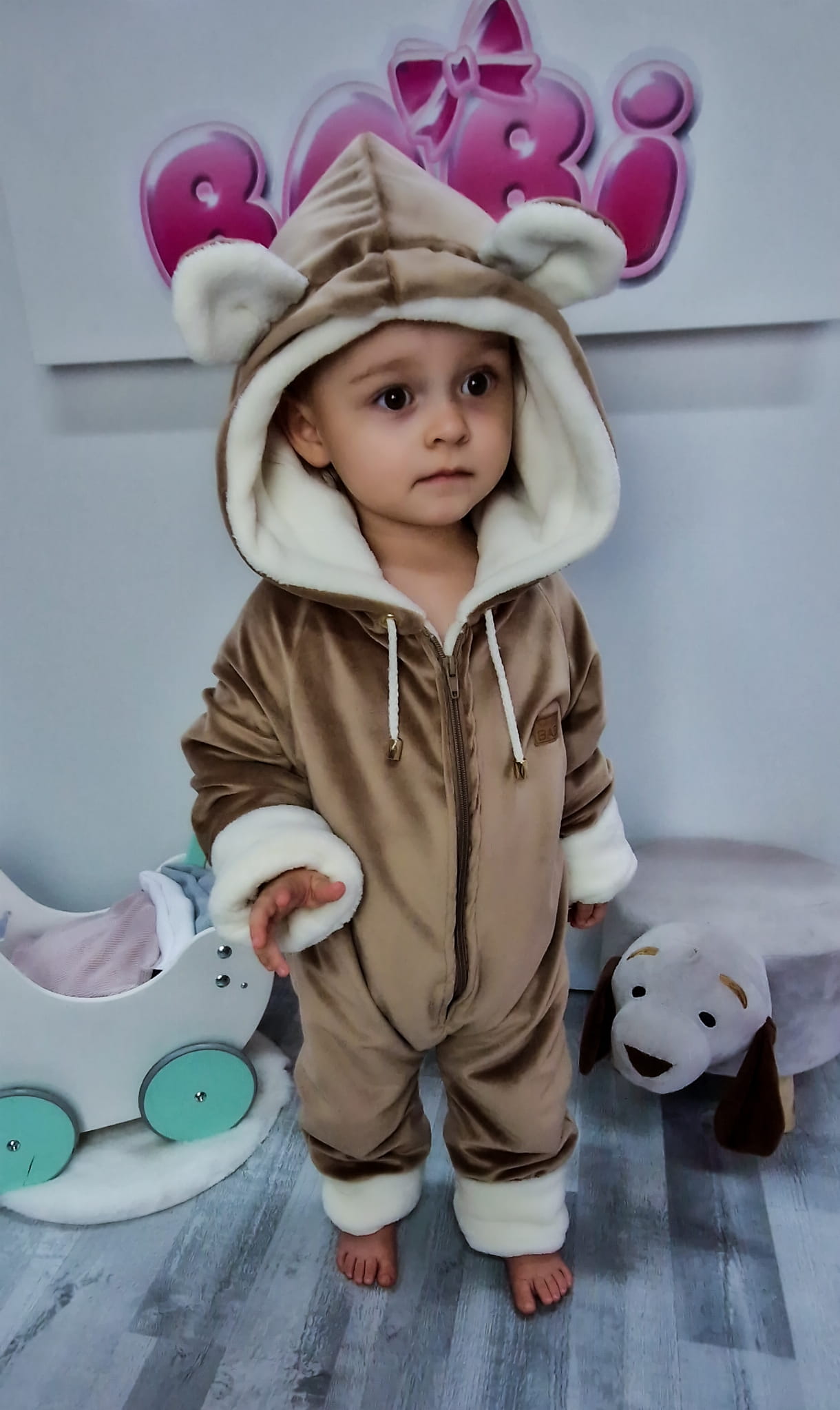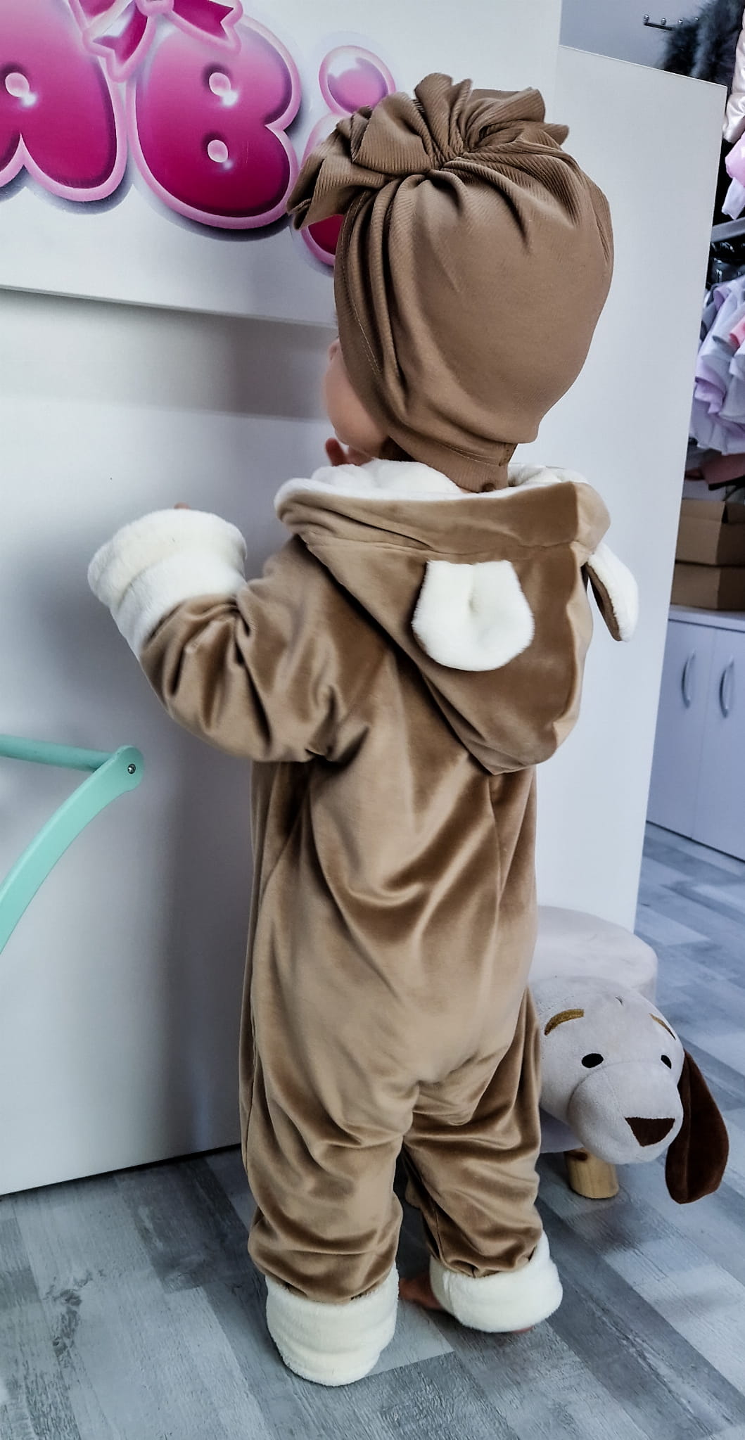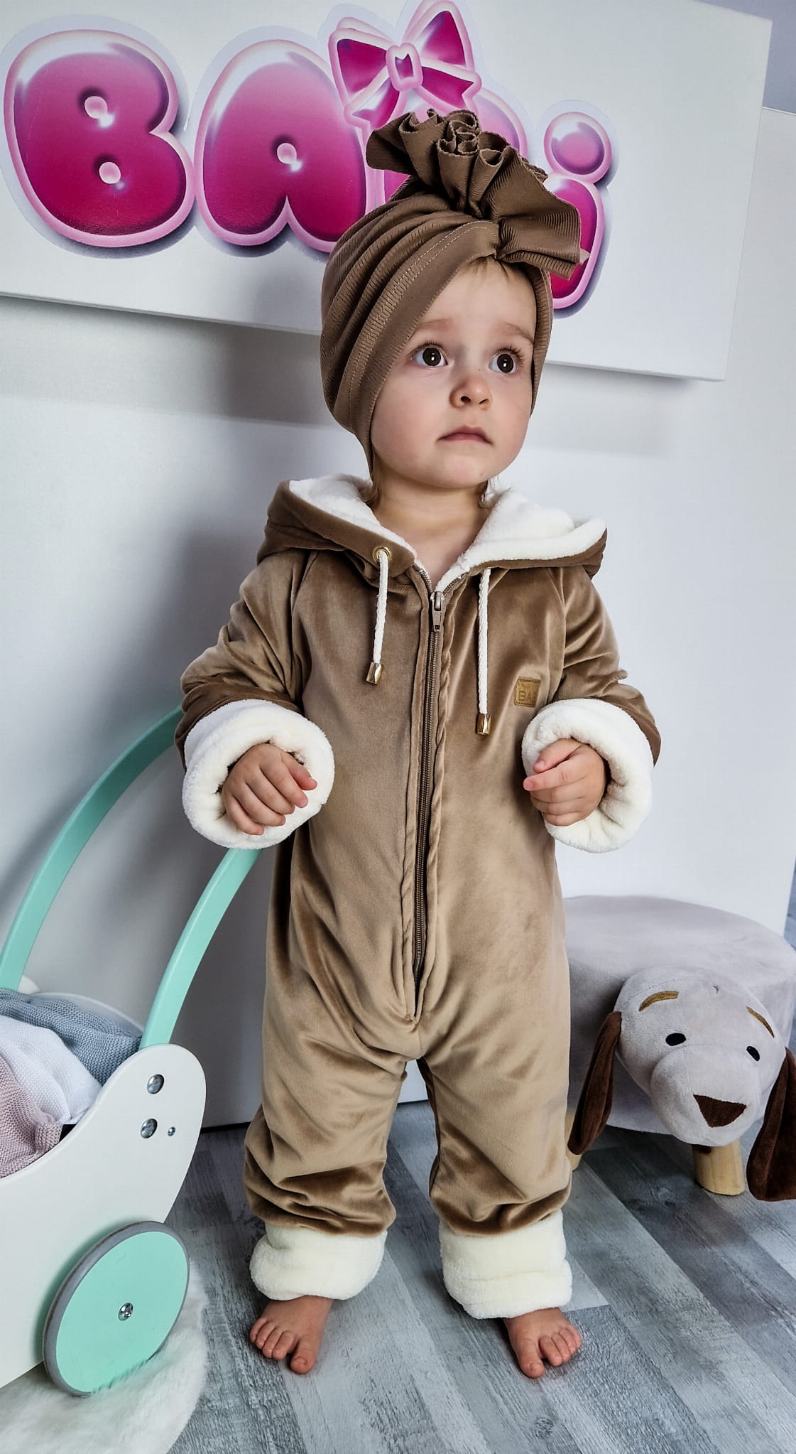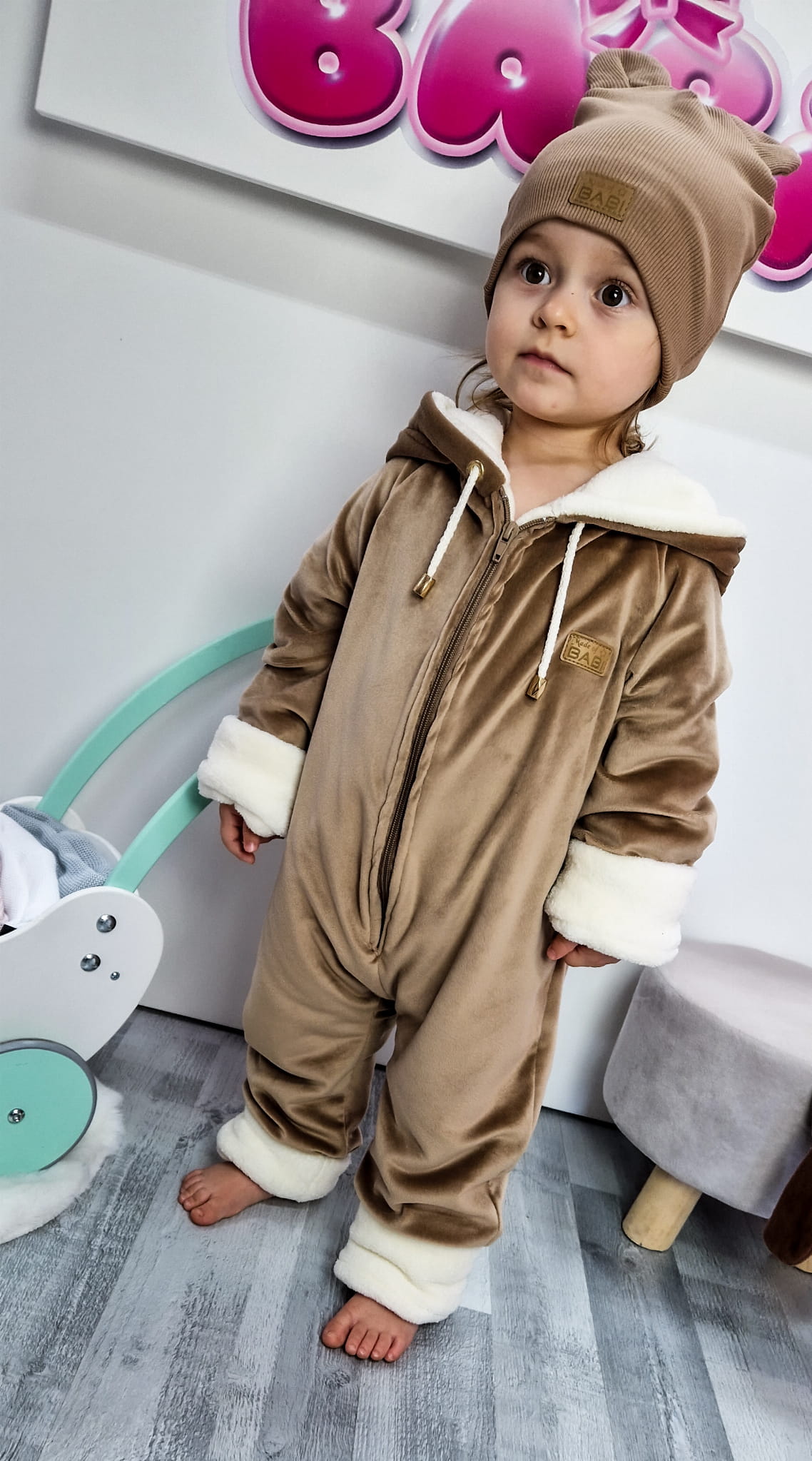 Ocieplany welurowy pajac dziecięcy brązowy welur miś plus kremowy plusz