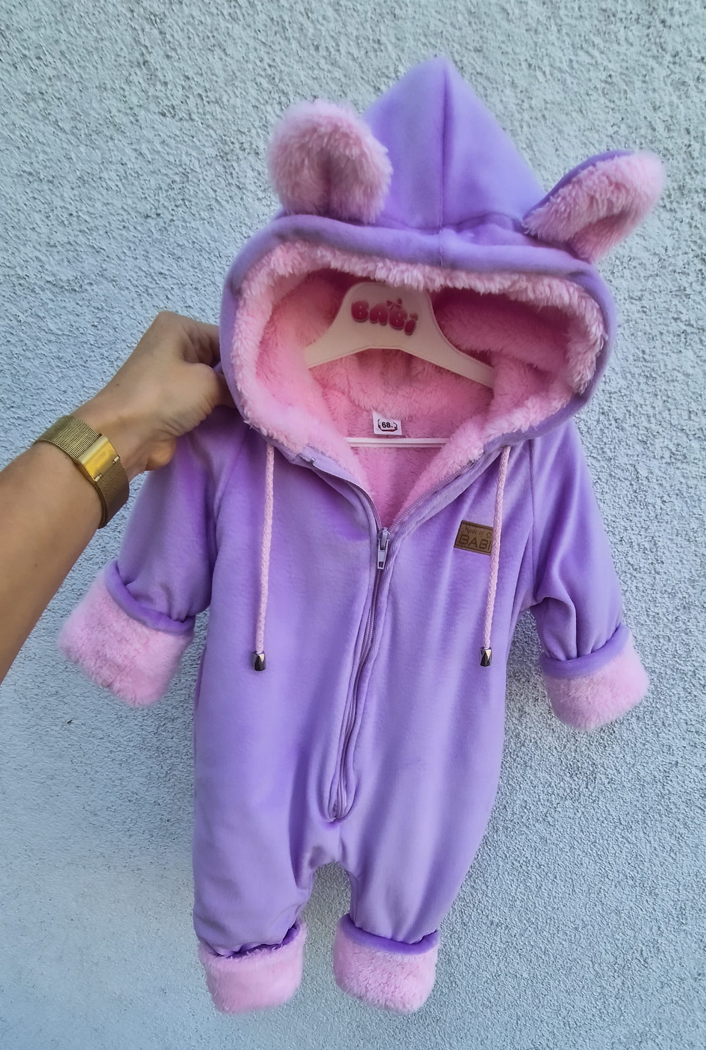Ocieplany welurowy pajac dziecięcy niemowlęcy lila miś plus różowy plusz