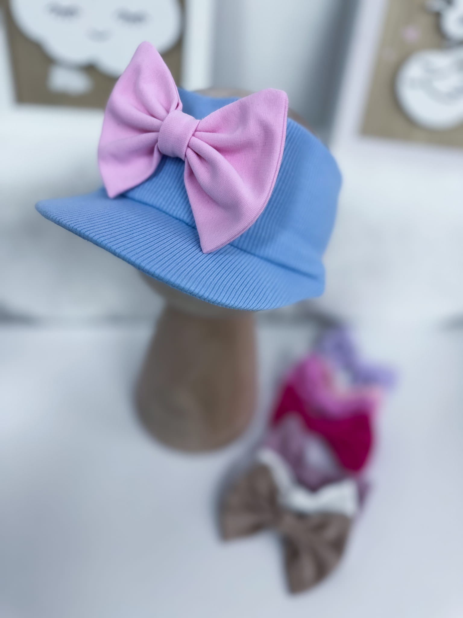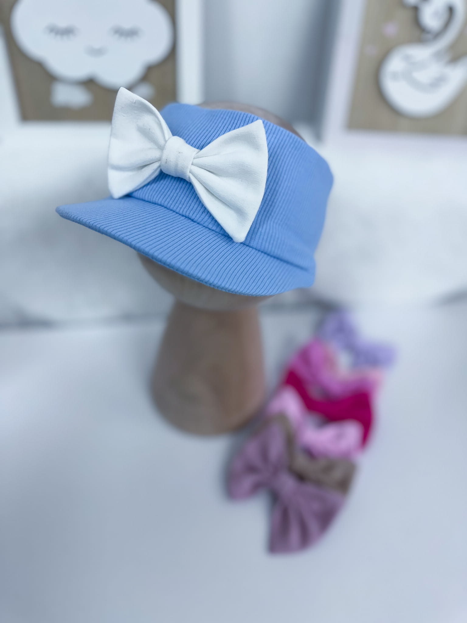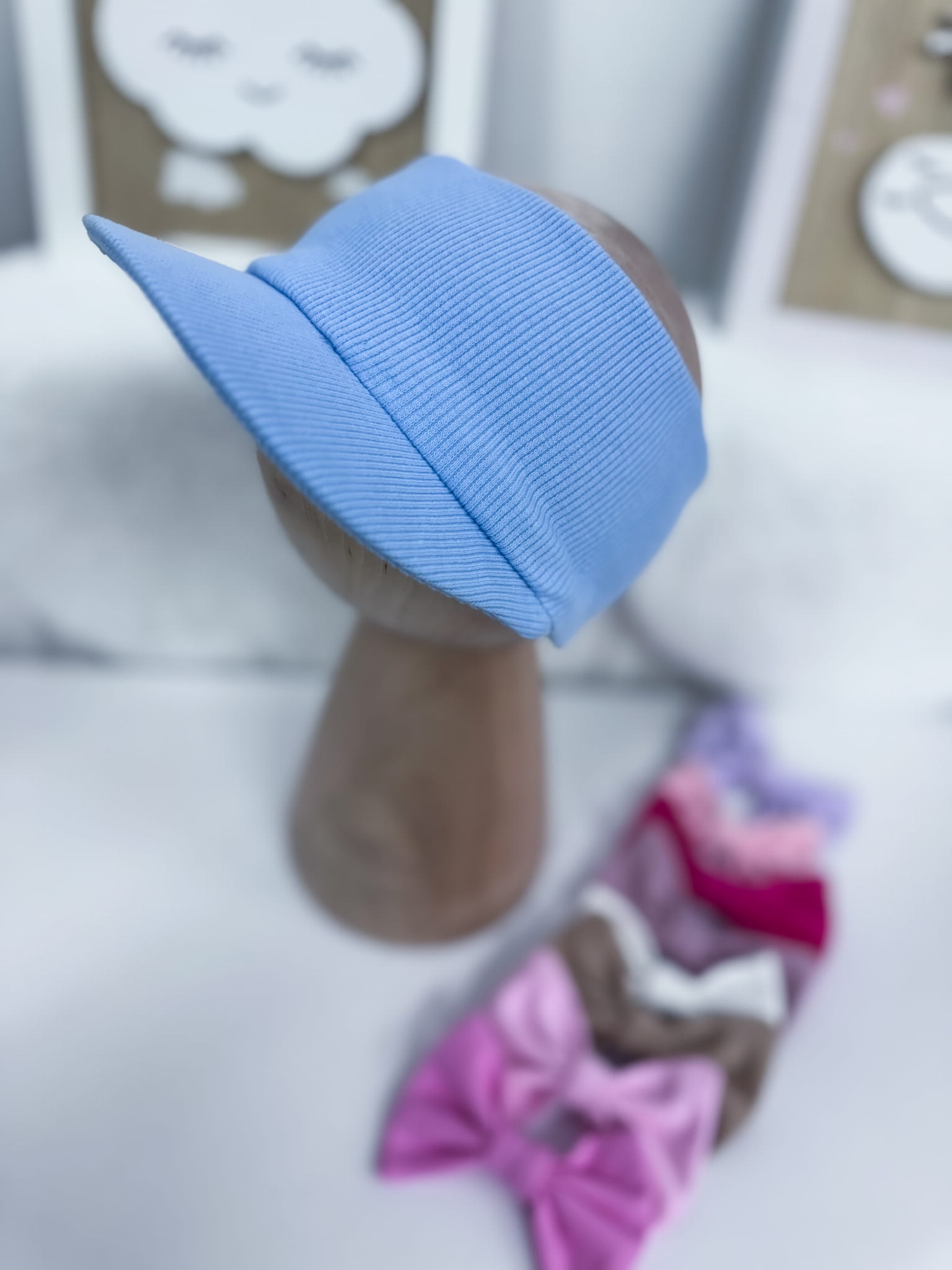 Opaska z daszkiem prążkowana BŁĘKITNA z kokardką lub bez