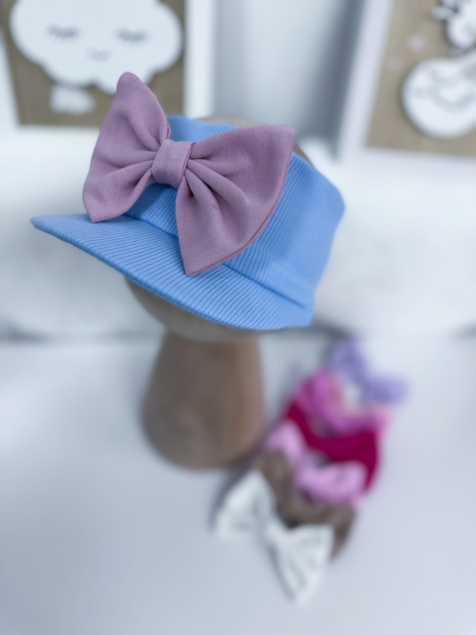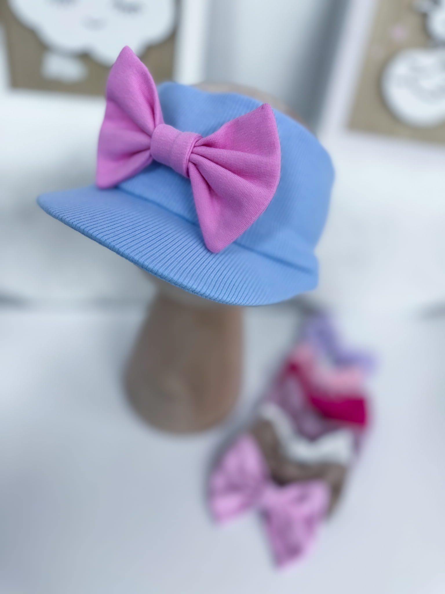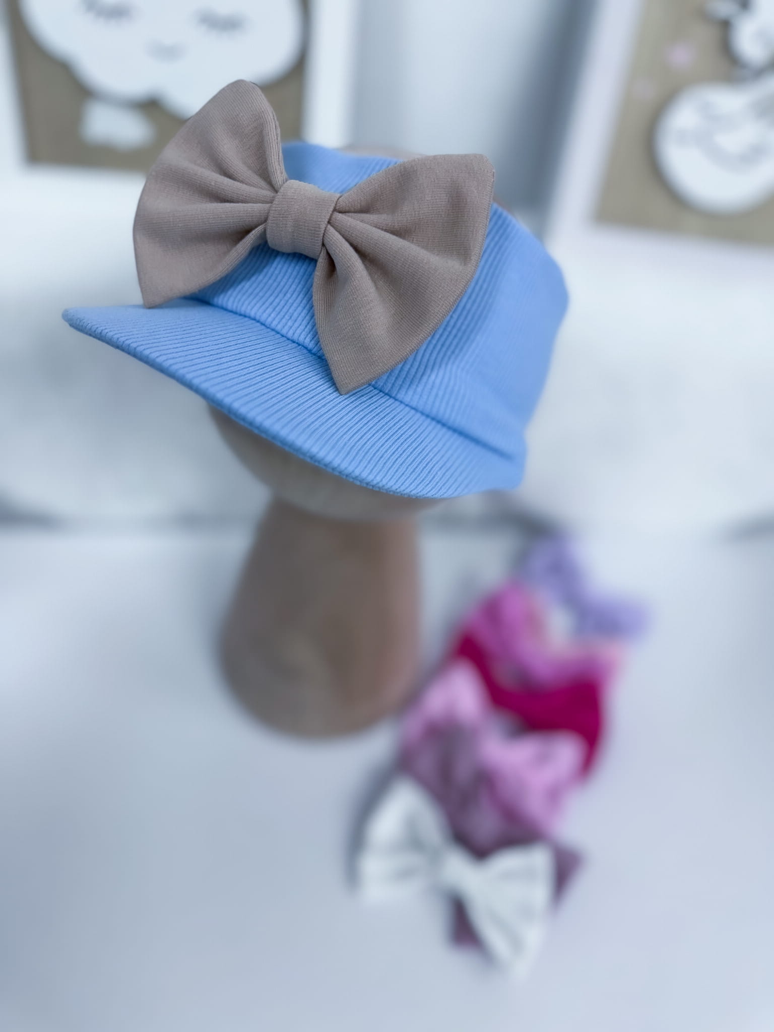 Opaska z daszkiem prążkowana BŁĘKITNA z kokardką lub bez
