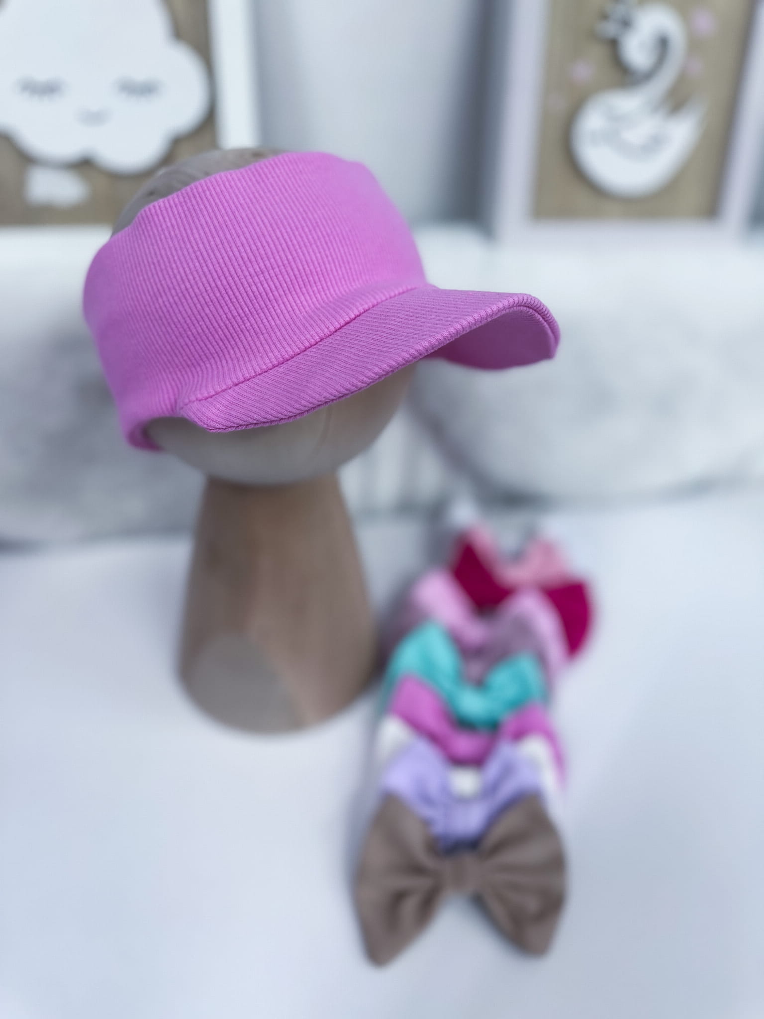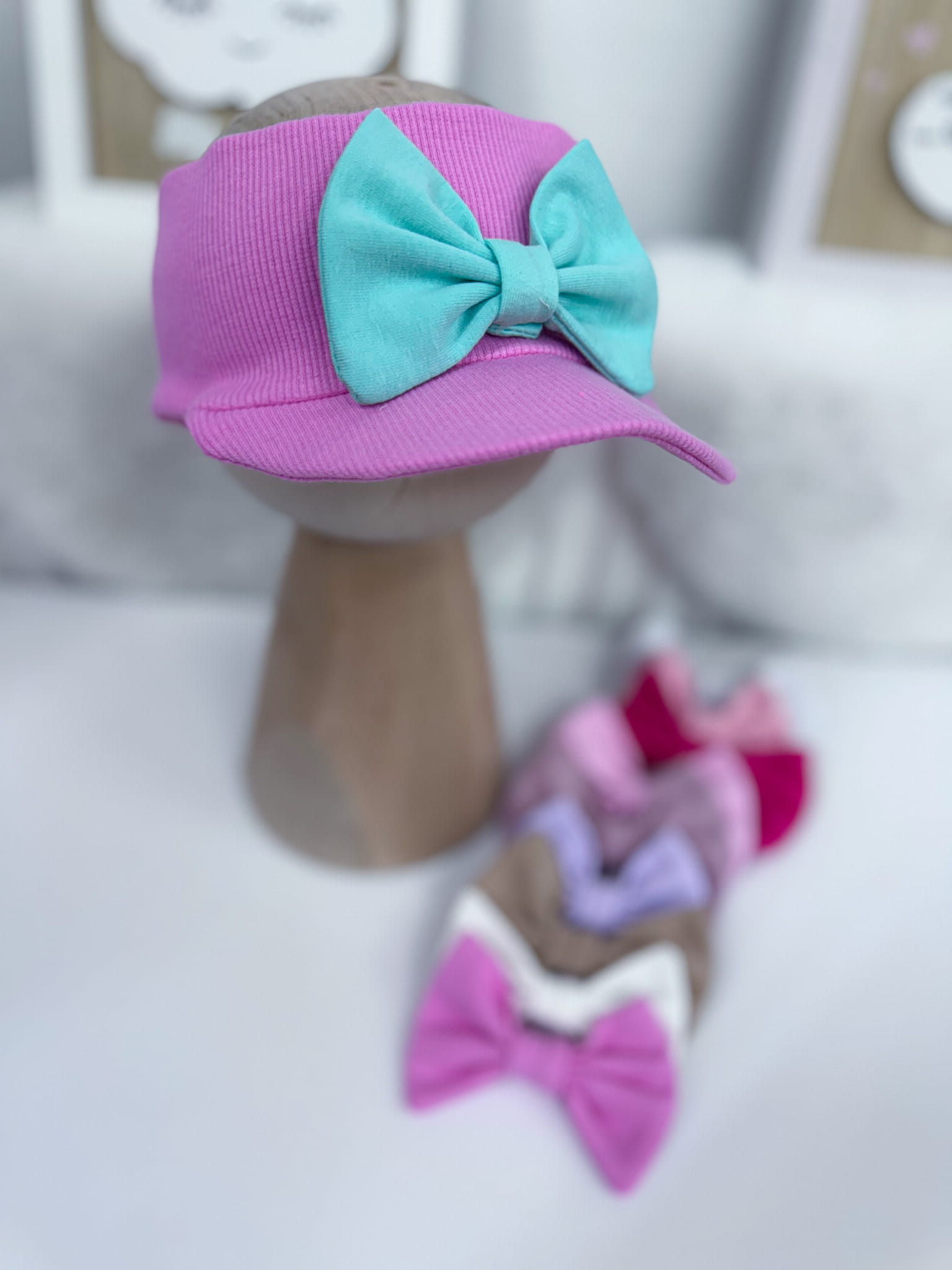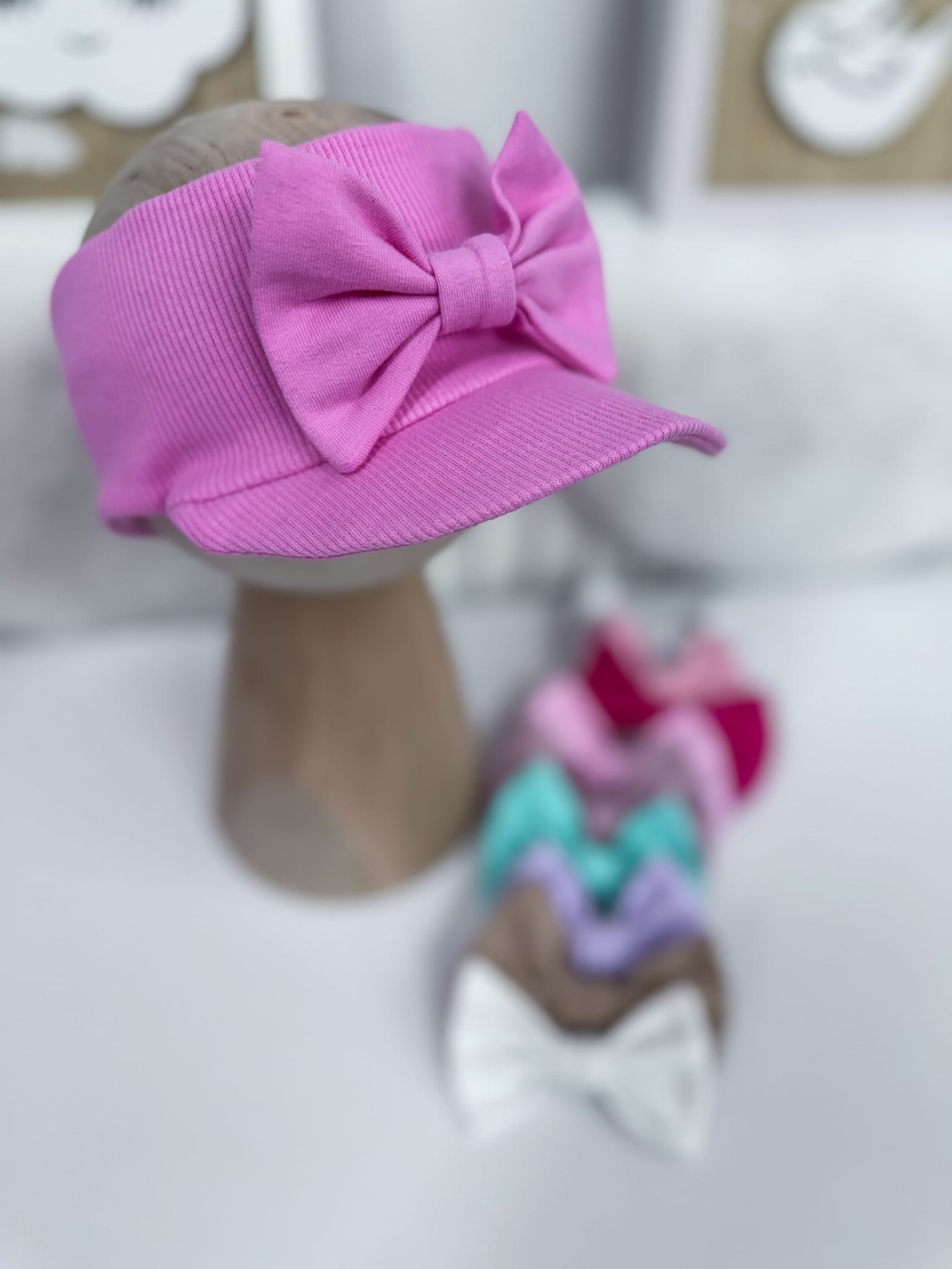 Opaska z daszkiem prążkowana RÓŻ CUKIERKOWY z kokardką lub bez