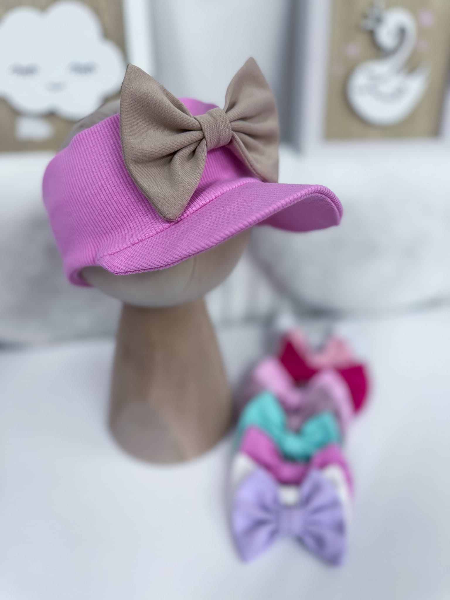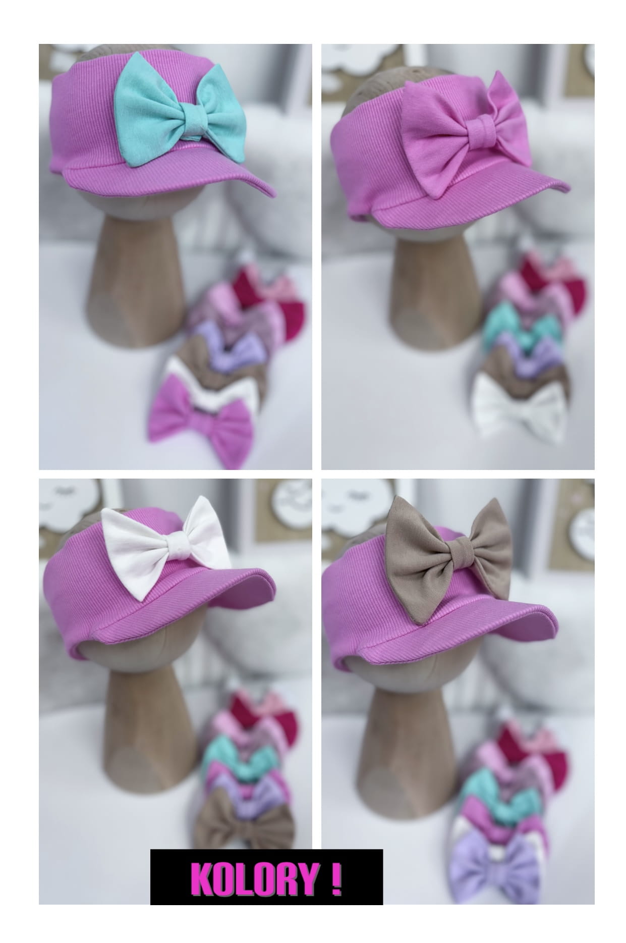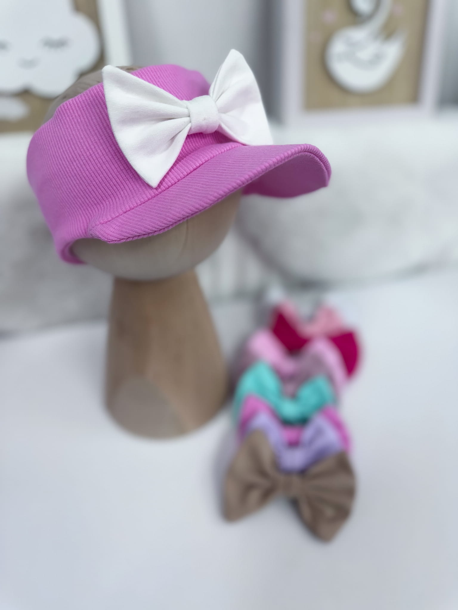 Opaska z daszkiem prążkowana RÓŻ CUKIERKOWY z kokardką lub bez
