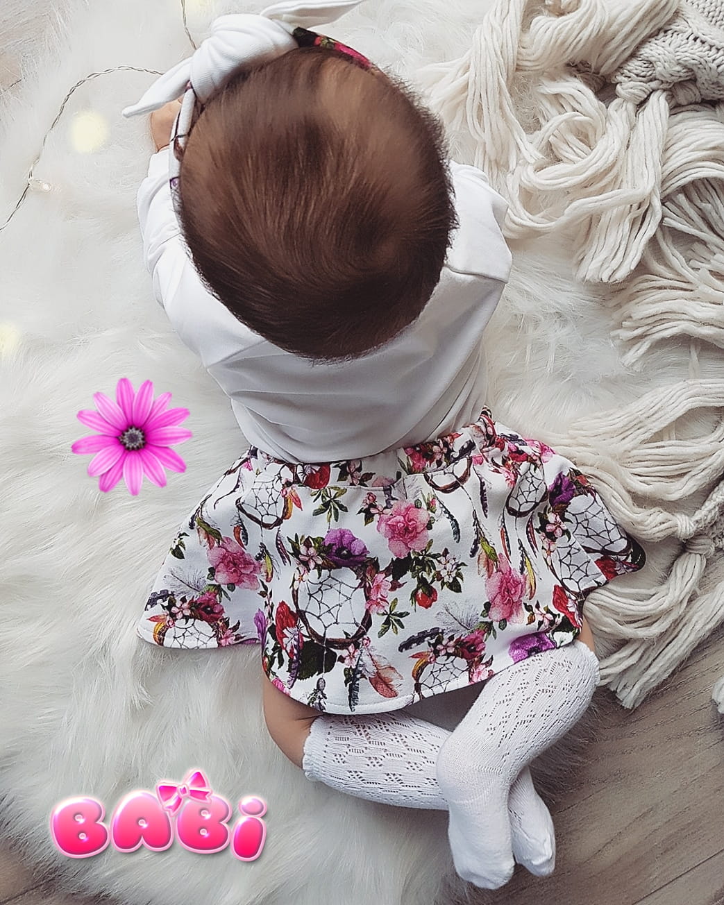 Producent Małgorzata LochertKomplet dla dziewczynki dzwony prążkowane stokrotki na różu plus opaska plus body lub bluzka kremowa prążkowana