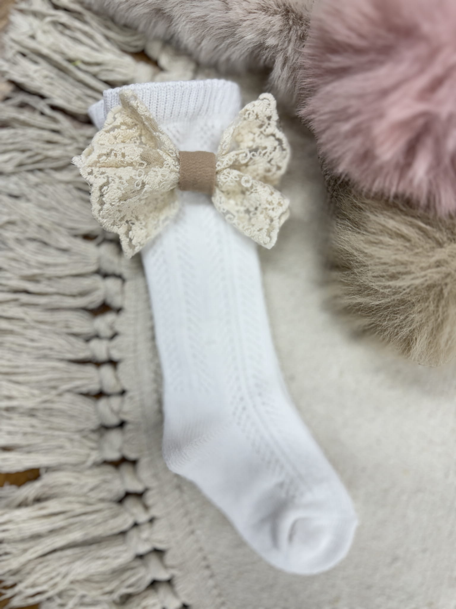 Producent Małgorzata LochertPodkolanówki ażurowe dziecięce z kokardkami koronka bezowa plus róż pasek welur