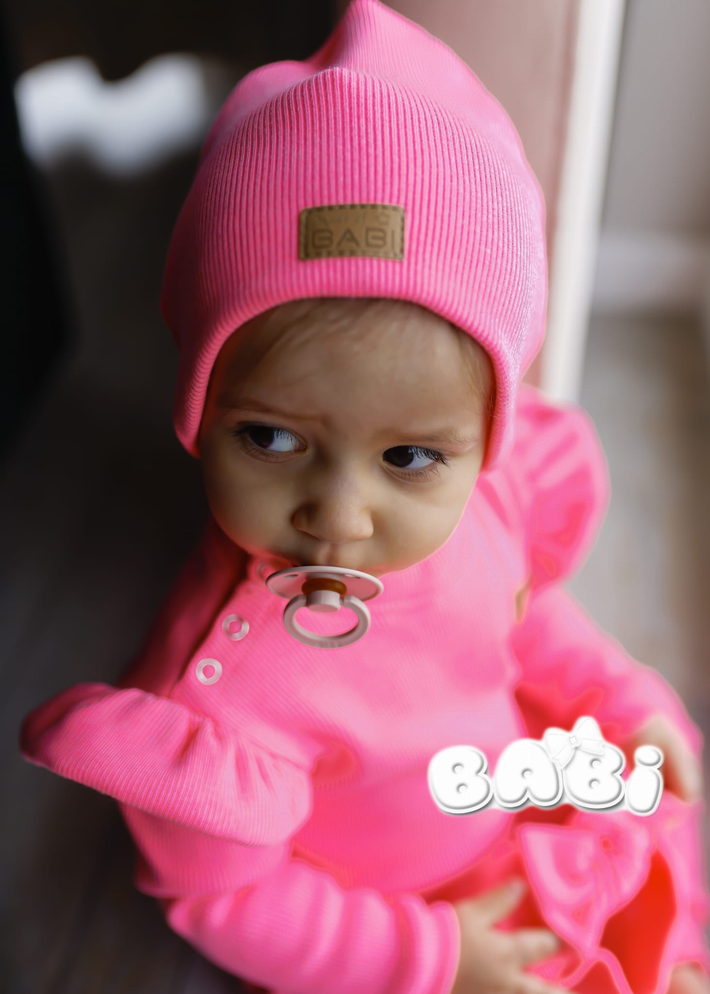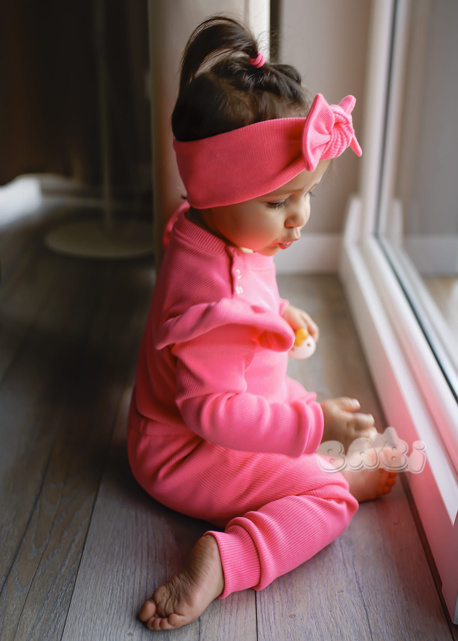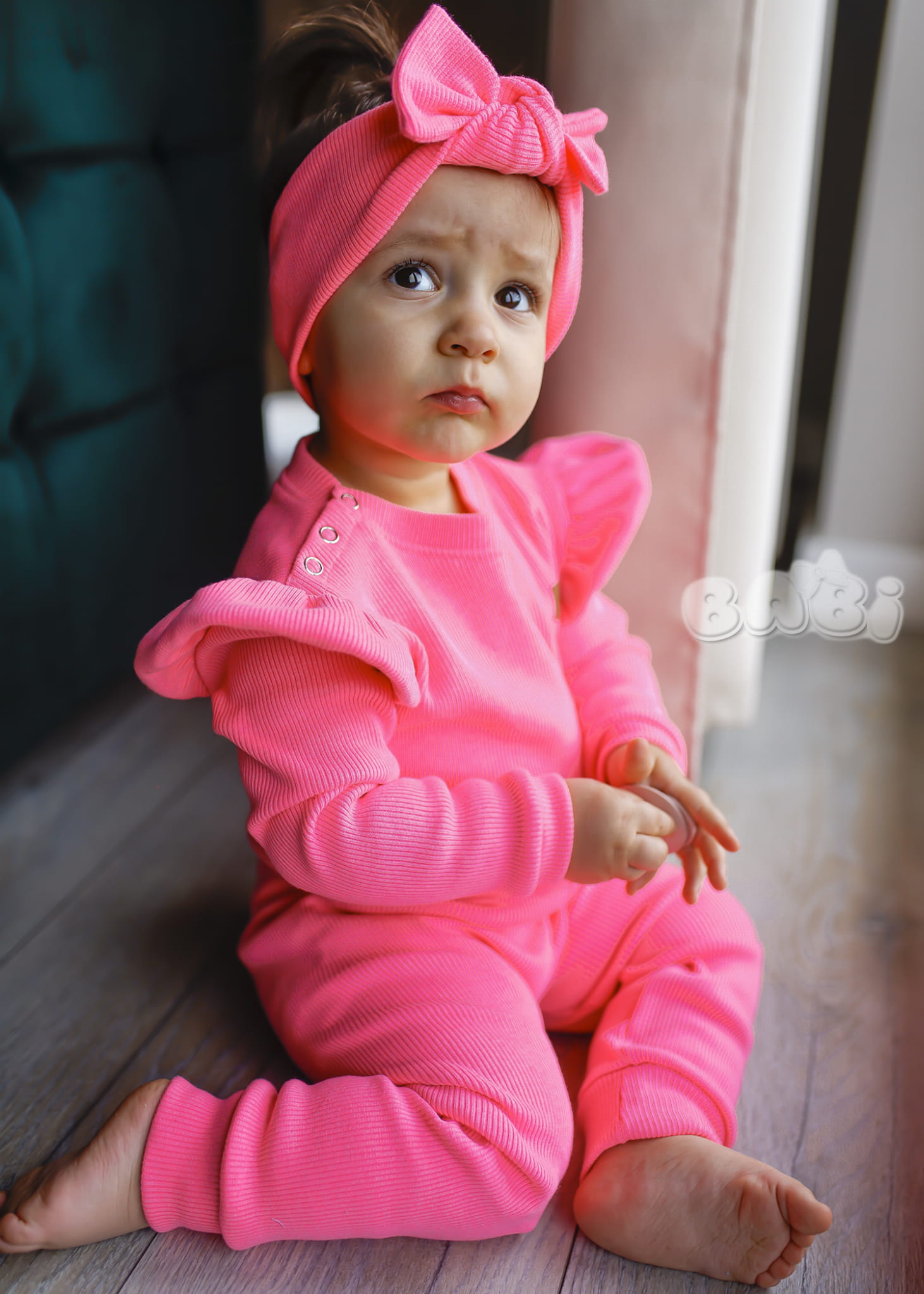 Prążkowany komplet dla dziecka mussi kolor róż neon spodnie plus body lub bluzka