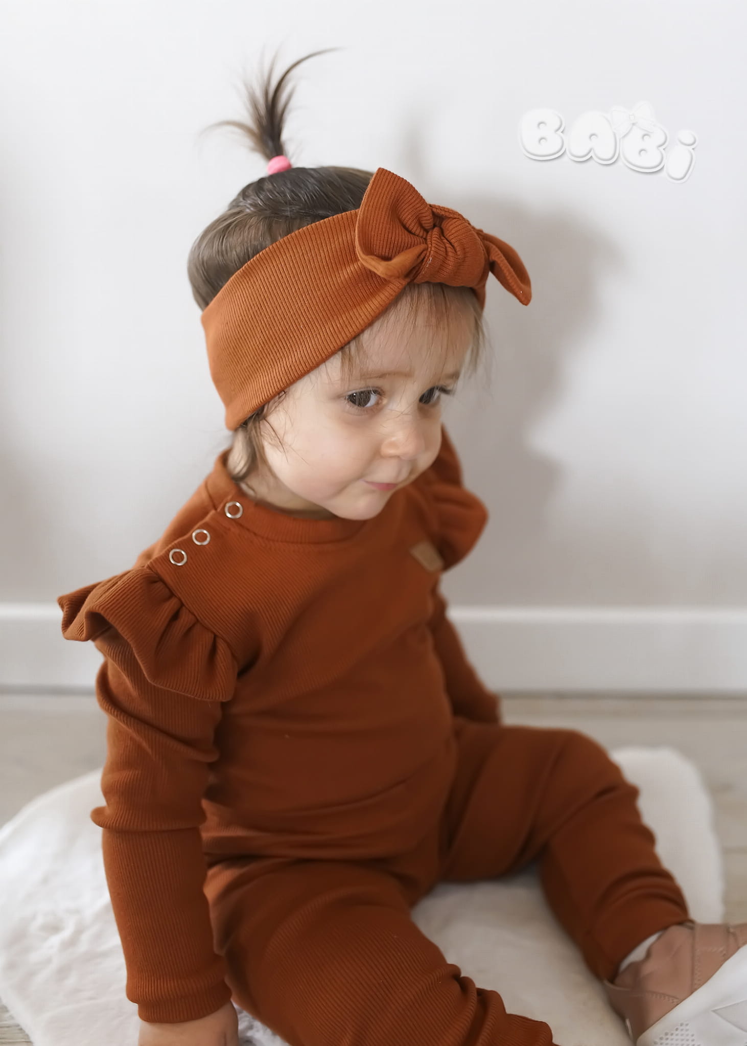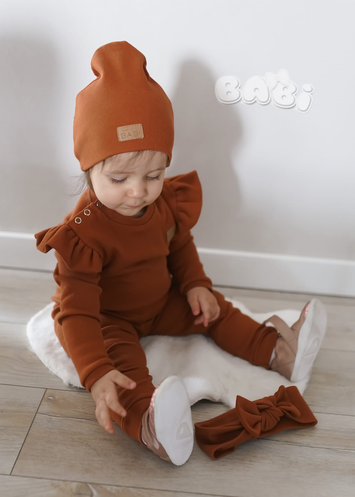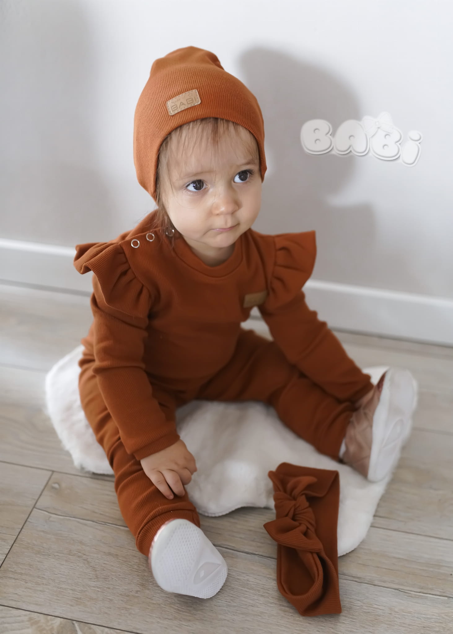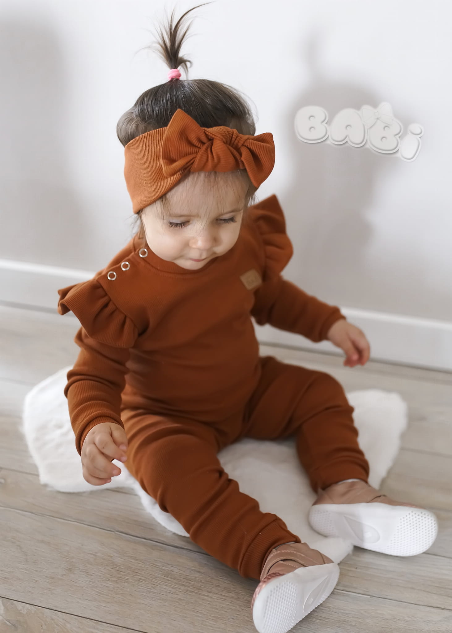 Prążkowany komplet dla dziecka musso kolor karmel spodnie plus body lub bluzka