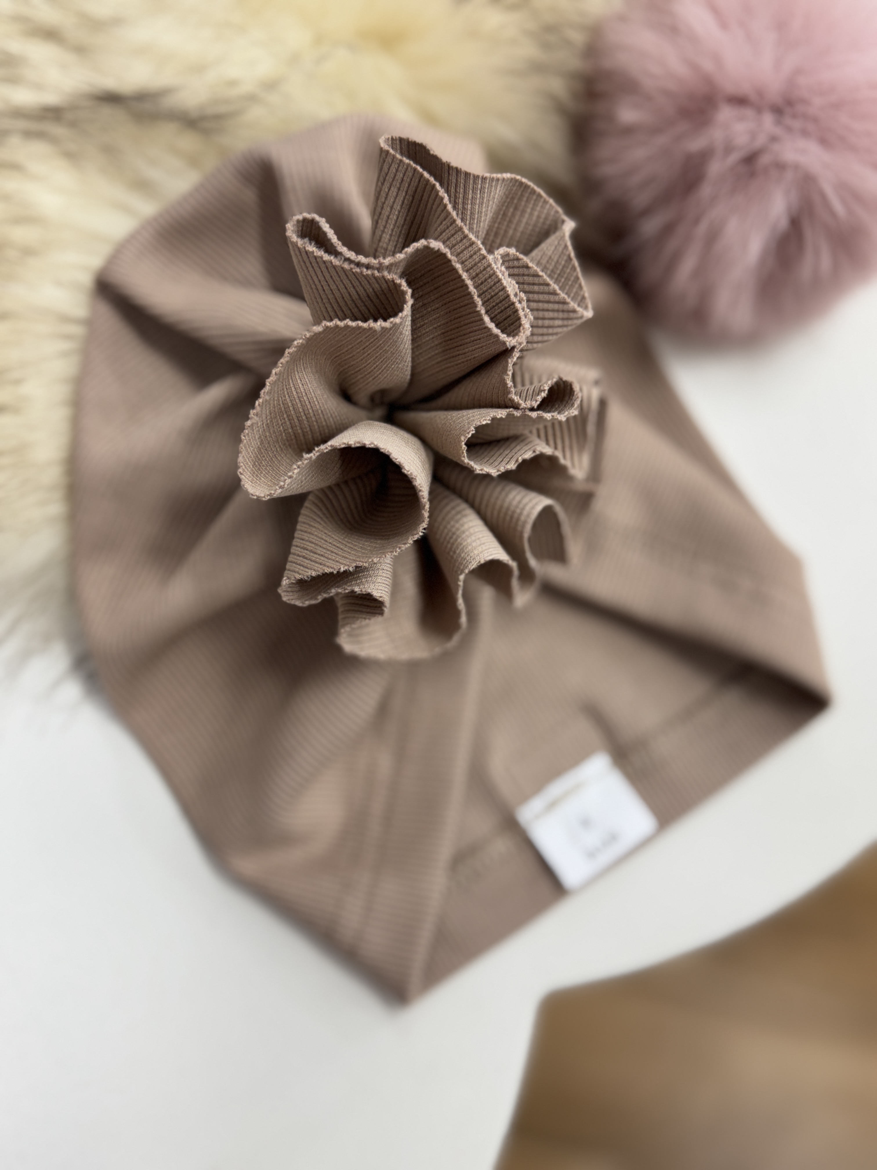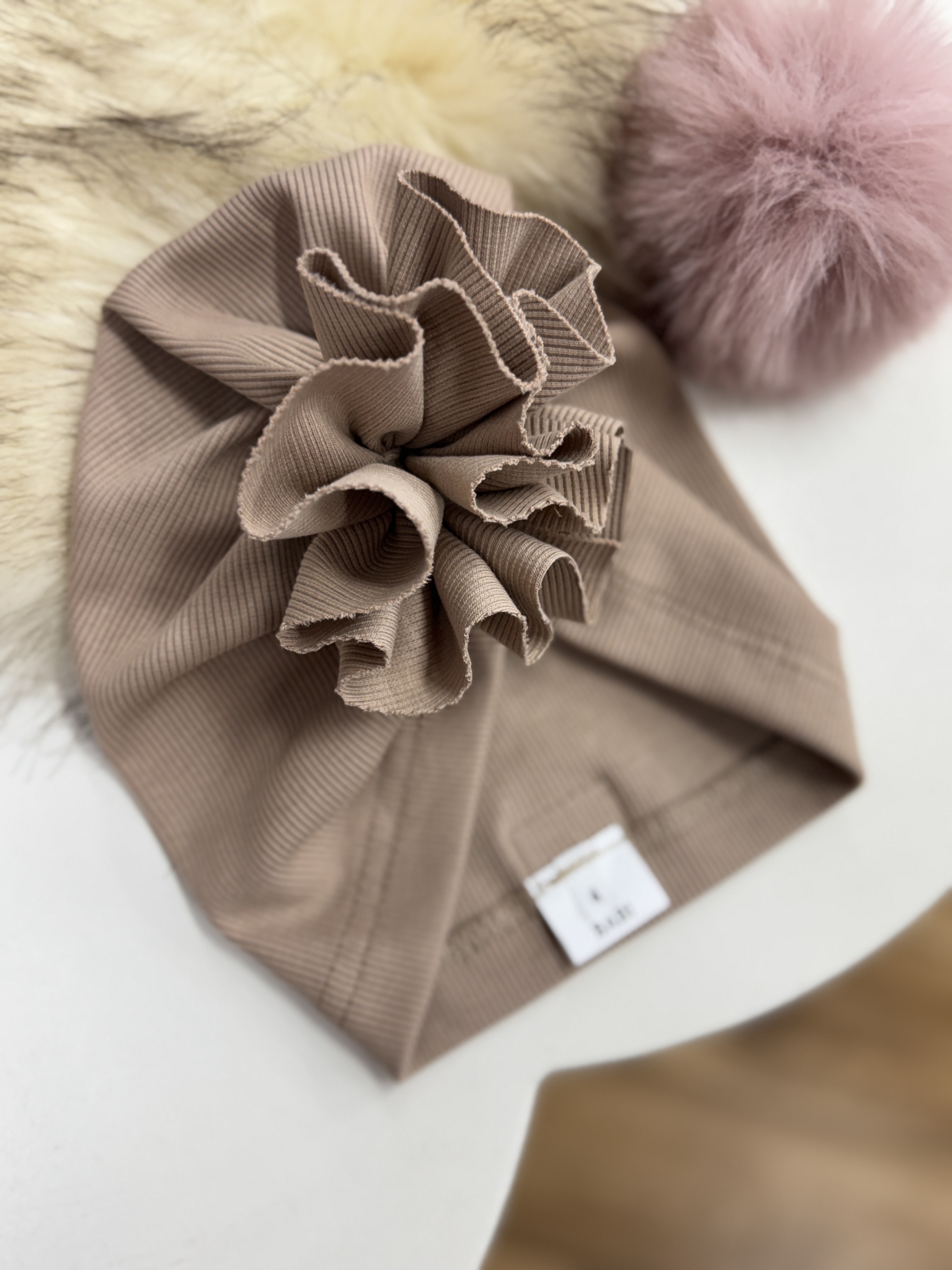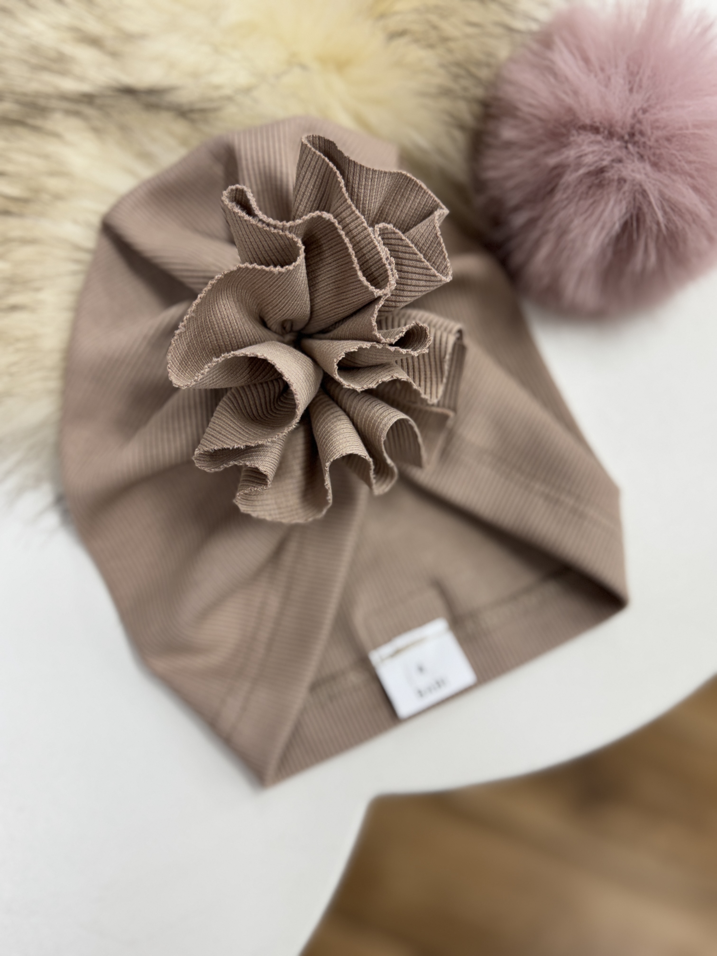 Turban dziecięcy beżowy prążek różyczka